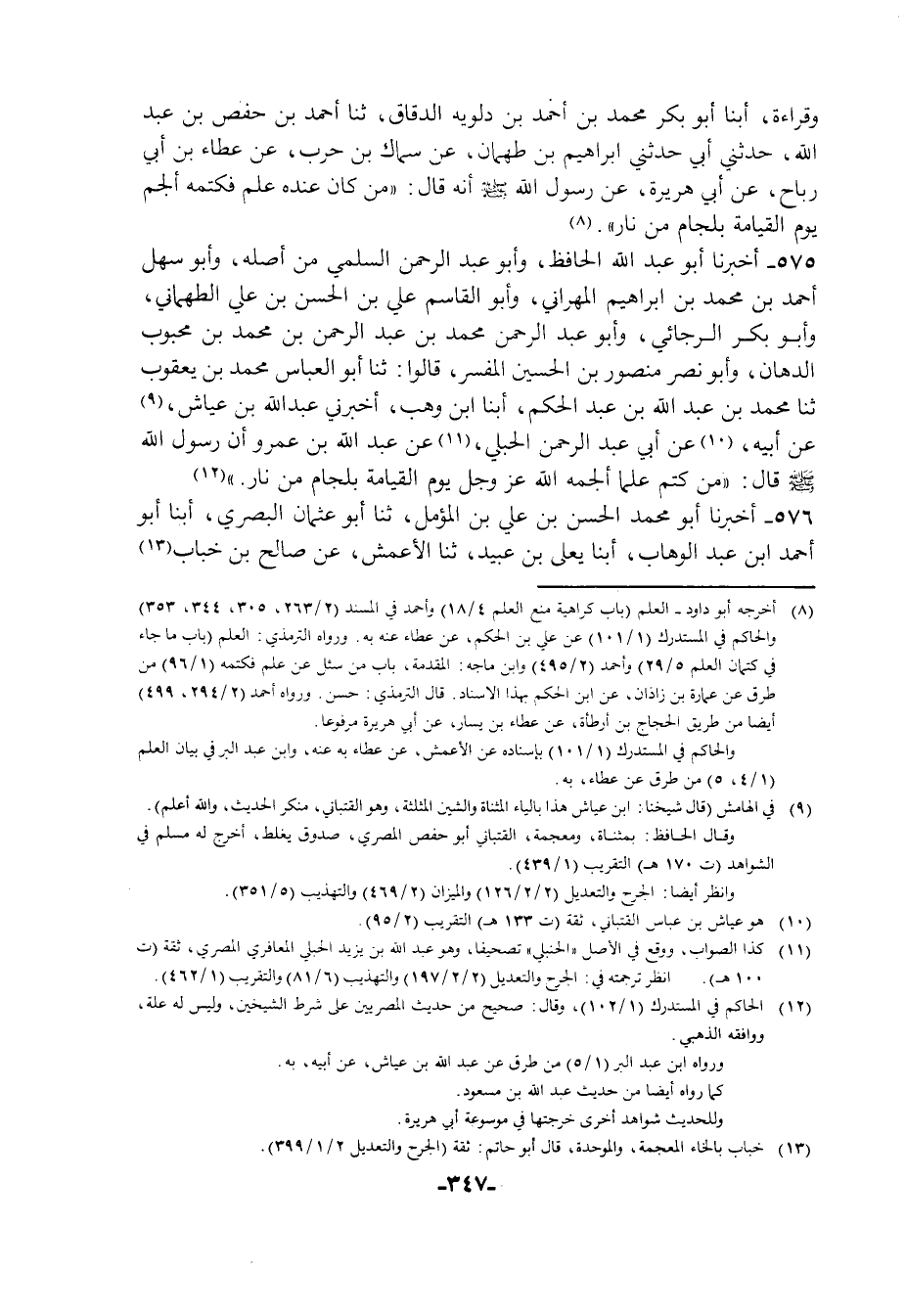 575 - أَخْبَرَنَا أَبُو عَبْدِ اللَّهِ الْحَافِظُ، وَأَبُو عَبْدِ الرَّحْمَنِ السُّلَمِيُّ، مِنْ أَصْلِهِ وَأَبُو سَهْلٍ أَحْمَدُ بْنُ مُحَمَّدِ بْنِ إِبْرَاهِيمَ الْمَهْرَانِيُّ وَأَبُو الْقَاسِمِ عَلِيُّ بْنُ الْحَسَنِ بْنِ عَلِيٍّ الطَّهْمَانِيُّ وَأَبُو بَكْرٍ الرَّجَائِيُّ وَأَبُو عَبْدِ الرَّحْمَنِ مُحَمَّدُ بْنُ عَبْدِ الرَّحْمَنِ بْنِ مُحَمَّدِ بْنِ مَحْبُوبٍ الدَّهَّانُ وَأَبُو نَصْرٍ مَنْصُورُ بْنُ الْحُسَيْنِ الْمُفَسِّرُ قَالُوا ثنا أَبُو الْعَبَّاسِ مُحَمَّدُ بْنُ يَعْقُوبَ، ثنا مُحَمَّدُ بْنُ عَبْدِ اللَّهِ بْنِ عَبْدِ الْحَكَمِ، أبنا ابْنُ وَهْبٍ، أَخْبَرَنِي عَبْدُ اللَّهِ بْنُ عَيَّاشٍ، عَنْ أَبِيهِ، عَنْ أَبِي عَبْدِ الرَّحْمَنِ الْحُبُلِيِّ، عَنْ عَبْدِ اللَّهِ بْنِ عَمْرٍو، أَنَّ رَسُولَ اللَّهِ صَلَّى اللهُ عَلَيْهِ وَسَلَّمَ قَالَ: §«مَنْ كَتَمَ عِلْمًا أَلْجَمَهُ اللَّهُ عَزَّ وَجَلَّ يَوْمَ الْقِيَامَةِ بِلِجَامٍ مِنْ نَارٍ»