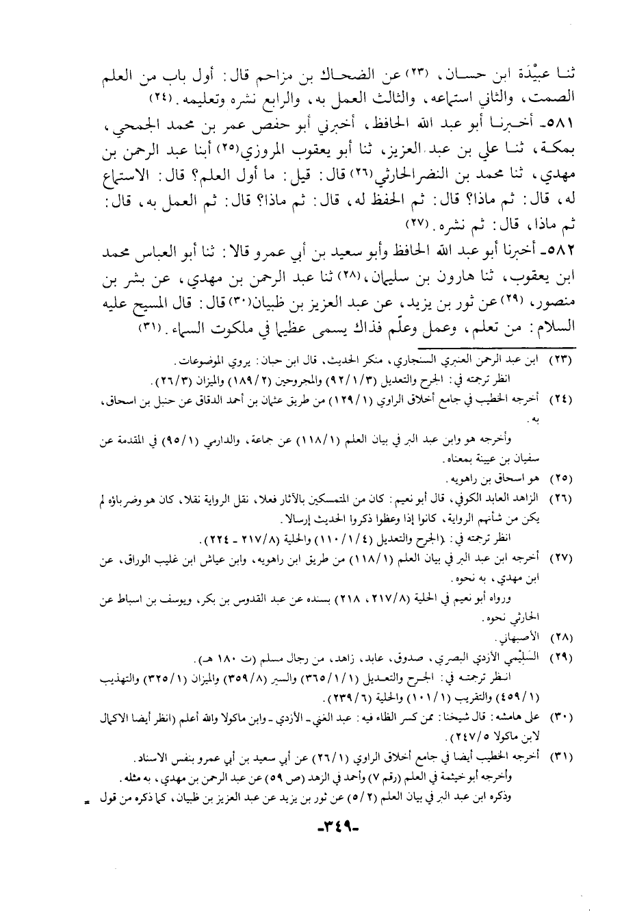 581 - أَخْبَرَنَا أَبُو عَبْدِ اللَّهِ الْحَافِظُ، أَخْبَرَنِي أَبُو حَفْصٍ عُمَرُ بْنُ مُحَمَّدِ الْجُمَحِيُّ بِمَكَّةَ، ثنا عَلِيُّ بْنُ عَبْدِ الْعَزِيزِ، ثنا أَبُو يَعْقُوبَ الْمَرْوَزِيُّ، أبنا عَبْدُ الرَّحْمَنِ بْنُ مَهْدِيٍّ، ثنا مُحَمَّدُ بْنُ النَّضْرِ الْحَارِثِيُّ، قَالَ: قِيلَ §مَا أَوَّلُ الْعِلْمِ؟، قَالَ: الِاسْتِمَاعُ لَهُ، قَالَ: ثُمَّ مَاذَا؟، قَالَ: ثُمَّ الْحِفْظُ لَهُ، قَالَ: ثُمَّ مَاذَا؟، قَالَ: ثُمَّ الْعَمَلُ بِهِ، قَالَ: ثُمَّ مَاذَا؟، قَالَ: ثُمَّ نَشْرُهُ