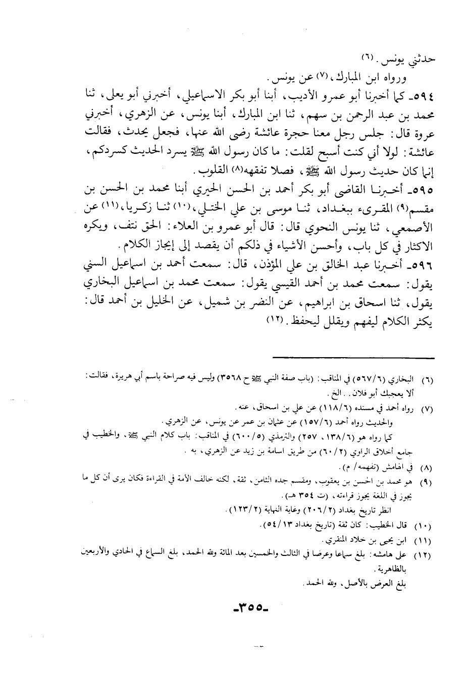 594 - كَمَا أَخْبَرَنَا أَبُو عَمْرٍو الْأَدِيبُ، أبنا أَبُو بَكْرٍ الْإِسْمَاعِيلِيُّ، أَخْبَرَنِي أَبُو يَعْلَى، ثنا مُحَمَّدُ بْنُ عَبْدِ الرَّحْمَنِ بْنِ سَهْمٍ، ثنا ابْنُ الْمُبَارَكِ، أبنا يُونُسُ، عَنِ الزُّهْرِيِّ، أَخْبَرَنِي عُرْوَةُ، قَالَ: جَلَسَ رَجُلٌ مَعَنَا حُجْرَةَ عَائِشَةَ رَضِيَ اللَّهُ عَنْهَا فَجَعَلَ يُحَدِّثُ، فَقَالَتْ عَائِشَةُ: لَوْلَا أَنِّي كُنْتُ أُسَبِّحُ لَقُلْتُ: مَا كَانَ رَسُولُ اللَّهِ صَلَّى اللهُ عَلَيْهِ وَسَلَّمَ يُسْرِدُ الْحَدِيثَ كَسَرْدِكُمْ، إِنَّمَا كَانَ §حَدِيثُ رَسُولِ اللَّهِ صَلَّى اللهُ عَلَيْهِ وَسَلَّمَ فَصْلًا تَفْقَهُهُ الْقُلُوبُ