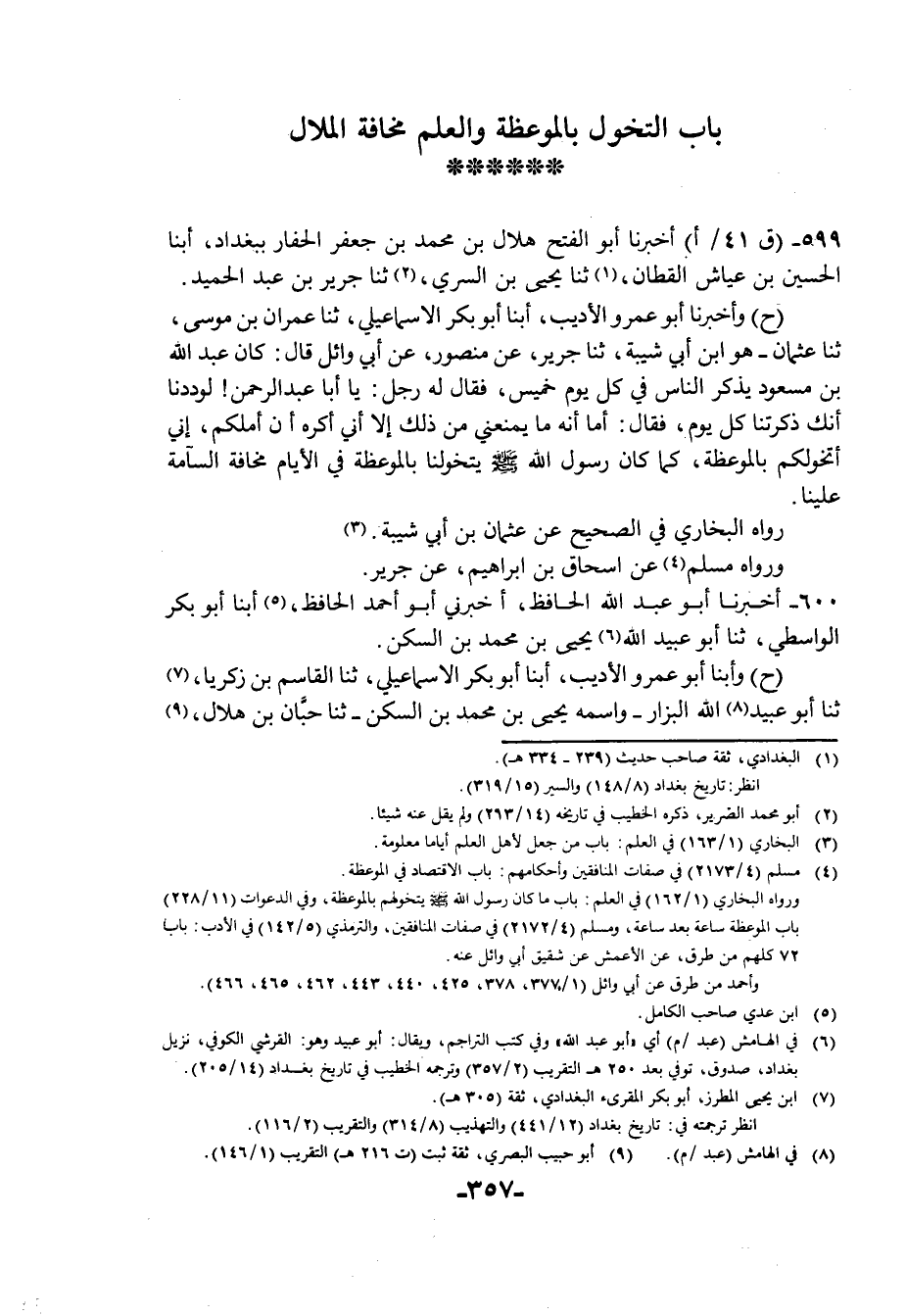 599 - أَخْبَرَنَا أَبُو الْفَتْحِ هِلَالُ بْنُ مُحَمَّدِ بْنِ جَعْفَرٍ الْحَفَّارُ بِبَغْدَادَ أبنا الْحُسَيْنُ بْنُ عَيَّاشٍ الْقَطَّانُ، ثنا يَحْيَى بْنُ السَّرِيِّ، ثنا جَرِيرُ بْنُ عَبْدِ الْحَمِيدِ، ح وَأَخْبَرَنَا أَبُو عَمْرٍو الْأَدِيبُ، أبنا أَبُو بَكْرٍ الْإِسْمَاعِيلِيُّ، ثنا عِمْرَانُ بْنُ مُوسَى، ثنا عُثْمَانُ، هُوَ ابْنُ أَبِي شَيْبَةَ ثنا جَرِيرٌ، عَنْ مَنْصُورٍ، عَنْ أَبِي وَائِلٍ، قَالَ: كَانَ عَبْدُ اللَّهِ بْنُ مَسْعُودٍ يُذَكِّرُ النَّاسَ فِي كُلِّ يَوْمِ خَمِيسٍ، فَقَالَ لَهُ رَجُلٌ: يَا أَبَا عَبْدِ الرَّحْمَنِ لَوَدِدْنَا أَنَّكَ ذَكَّرْتَنَا كُلَّ يَوْمٍ، فَقَالَ: أَمَا أَنَّهُ مَا يَمْنَعُنِي مِنْ ذَلِكَ إِلَّا أَنِّي أَكْرَهُ أَنْ أُمِلَّكُمْ إِنِّي أَتَخَوَّلُكُمْ بِالْمَوْعِظَةِ كَمَا كَانَ رَسُولُ اللَّهِ صَلَّى اللهُ عَلَيْهِ وَسَلَّمَ §يَتَخَوَّلُنَا بِالْمَوْعِظَةِ فِي الْأَيَّامِ مَخَافَةَ السَّآمَةِ عَلَيْنَا، رَوَاهُ الْبُخَارِيُّ فِي الصَّحِيحِ عَنْ عُثْمَانَ بْنِ أَبِي شَيْبَةَ، وَرَوَاهُ مُسْلِمٌ عَنْ إِسْحَاقَ بْنِ إِبْرَاهِيمَ عَنْ جَرِيرٍ