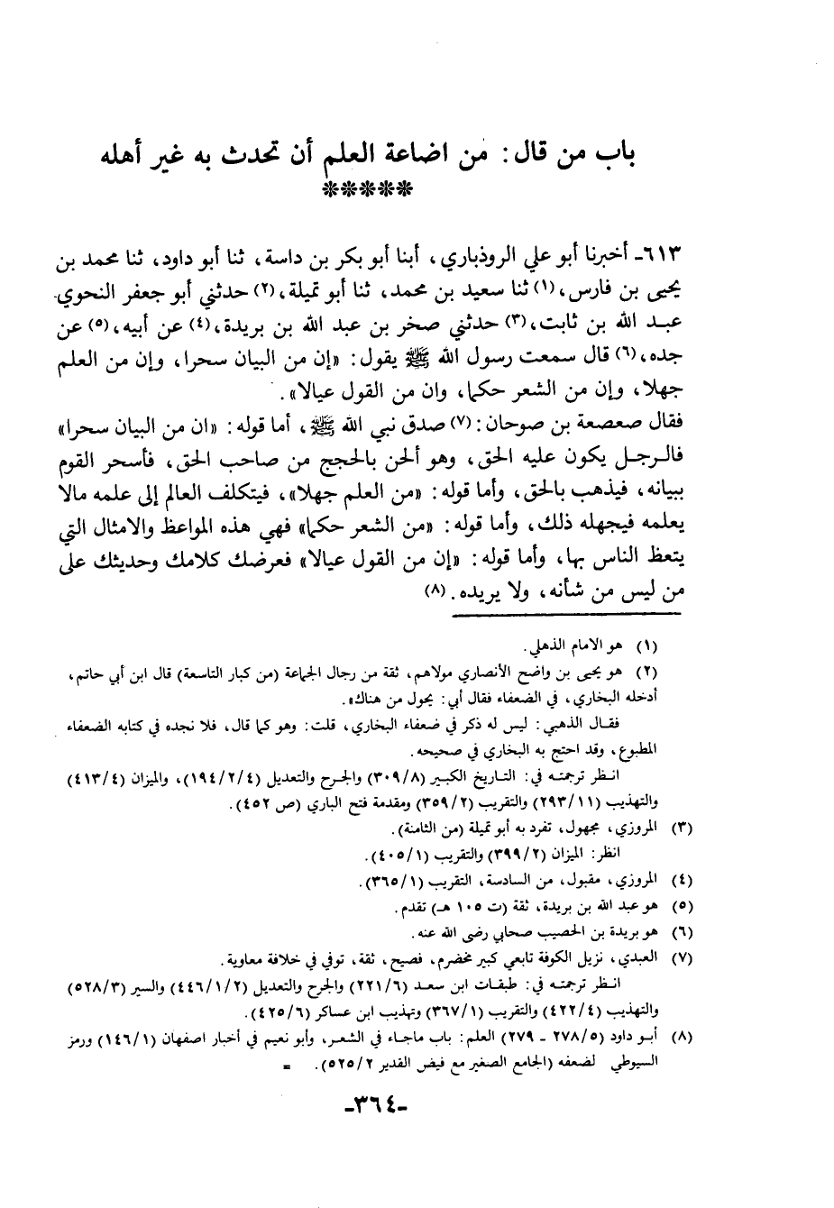 613 - أَخْبَرَنَا أَبُو عَلِيٍّ الرُّوذْبَارِيُّ، أبنا أَبُو بَكْرِ بْنُ دَاسَةَ، ثنا أَبُو دَاوُدَ، ثنا مُحَمَّدُ بْنُ يَحْيَى بْنِ فَارِسٍ، ثنا سَعِيدُ بْنُ مُحَمَّدٍ، ثنا أَبُو تُمَيْلَةَ، حَدَّثَنِي أَبُو جَعْفَرٍ النَّحْوِيُّ عَبْدُ اللَّهِ بْنُ ثَابِتٍ، حَدَّثَنِي صَخْرُ بْنُ عَبْدِ اللَّهِ بْنِ بُرَيْدَةَ، عَنْ أَبِيهِ، عَنْ جَدِّهِ، قَالَ: سَمِعْتُ رَسُولَ اللَّهِ صَلَّى اللهُ عَلَيْهِ وَسَلَّمَ يَقُولُ: «إِنَّ §مِنَ الْبَيَانِ سِحْرًا، وَإِنَّ مِنَ الْعِلْمِ جَهْلًا، وَإِنَّ مِنَ الشِّعْرِ حِكَمًا، وَإِنَّ مِنَ الْقَوْلِ عِيَالًا» ، فَقَالَ صَعْصَعَةُ بْنُ صُوحَانَ: صَدَقَ نَبِيُّ اللَّهِ صَلَّى اللهُ عَلَيْهِ وَسَلَّمَ أَمَا قَوْلُهُ: «إِنَّ مِنَ الْبَيَانِ سِحْرًا» فَالرَّجُلُ يَكُونُ عَلَيْهِ الْحَقُّ وَهُوَ أَلْحَنُ بِالْحُجَجِ مِنْ صَاحِبِ الْحَقِّ فَأَسْحَرَ الْقَوْمَ بِبَيَانِهِ فَيَذْهَبُ بِالْحَقِّ، وَأَمَّا قَوْلُهُ: «مِنَ الْعِلْمِ جَهْلًا» ، فَيتَكَلَّفُ الْعَالِمُ إِلَى عِلْمِهِ مَا لَا يَعْلَمُهُ فَيُجَهِّلُهُ ذَلِكَ، وَأَمَّا قَوْلُهُ: «مِنَ الشِّعْرِ حِكَمًا» فَهِيَ هَذِهِ الْمَوَاعِظُ وَالْأَمْثَالُ الَّتِي يَتَّعِظُ النَّاسُ بِهَا، وَأَمَّا قَوْلُهُ: «إِنَّ مِنَ الْقَوْلِ عِيَالًا» فَعَرْضُكَ كَلَامَكَ وَحَدِيثَكَ عَلَى مَنْ لَيْسَ مِنْ شَأْنِهِ وَلَا يُرِيدُهُ