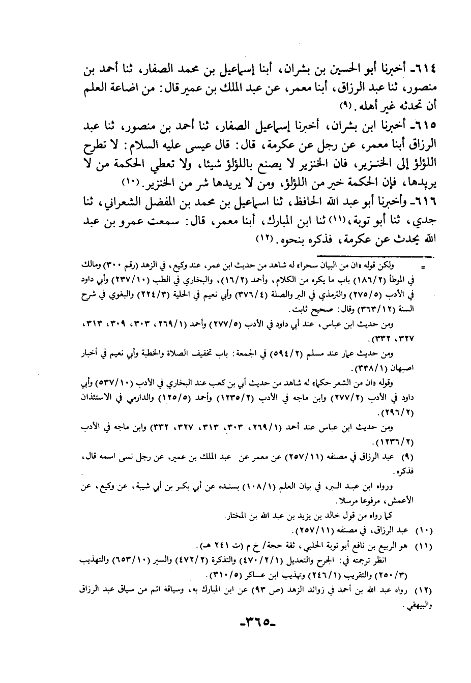 614 - أَخْبَرَنَا أَبُو الْحُسَيْنِ بْنُ بِشْرَانَ، أبنا إِسْمَاعِيلُ بْنُ مُحَمَّدٍ الصَّفَّارُ، ثنا أَحْمَدُ بْنُ مَنْصُورٍ، ثنا عَبْدُ الرَّزَّاقِ، أبنا مَعْمَرٌ، عَنْ عَبْدِ الْمَلِكِ بْنِ عُمَيْرٍ، قَالَ: §مِنْ إِضَاعَةِ الْعِلْمِ أَنْ تُحَدِّثَهُ غَيْرَ أَهْلِهِ