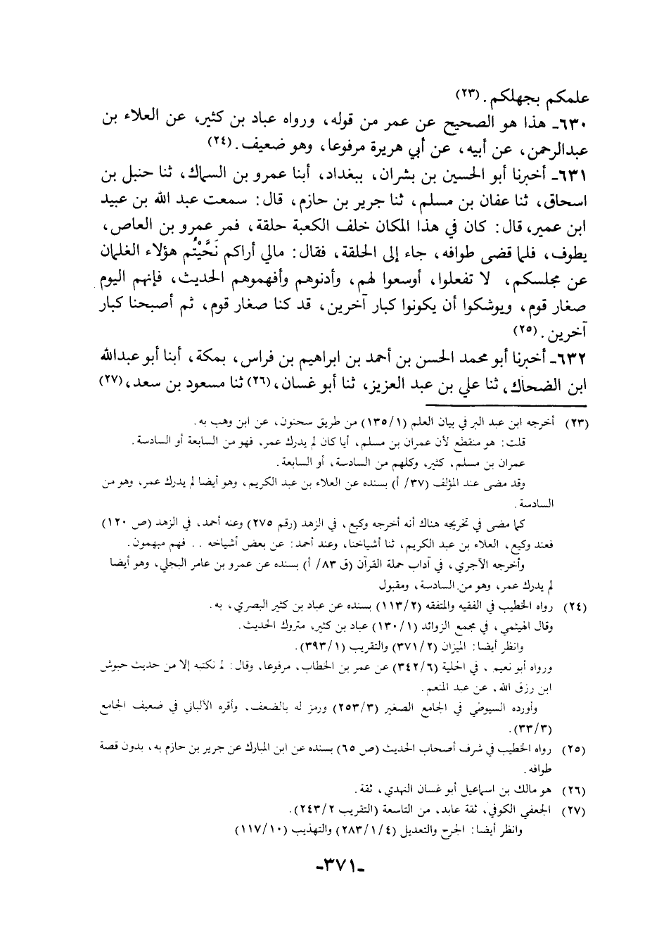 631 - أَخْبَرَنَا أَبُو الْحُسَيْنِ بْنُ بِشْرَانَ، بِبَغْدَادَ أبنا عَمْرُو بْنُ السَّمَّاكِ، ثنا حَنْبَلُ بْنُ إِسْحَاقَ، ثنا عَفَّانُ بْنُ مُسْلِمٍ، ثنا جَرِيرُ بْنُ حَازِمٍ، قَالَ: سَمِعْتُ عَبْدَ اللَّهِ بْنَ عُبَيْدِ بْنِ عُمَيْرٍ، قَالَ: كَانَ فِي هَذَا الْمَكَانِ خَلْفَ الْكَعْبَةِ حَلْقَةٌ فَمَرَّ عَمْرُو بْنُ الْعَاصِ يَطُوفُ فَلَمَّا قَضَى طَوَافَهُ جَاءَ إِلَى الْحَلْقَةِ، فَقَالَ: مَالِي §أَرَاكُمْ نَحَّيْتُمْ هَؤُلَاءِ الْغِلْمَانَ عَنْ مَجْلِسِكُمْ لَا تَفْعَلُوا أَوْسِعُوا لَهُمْ وَأَدْنُوهُمْ، وَأَفْهِمُوهُمُ الْحَدِيثَ فَإِنَّهُمُ الْيَوْمَ صِغَارُ قَوْمٍ وَيُوشِكُوا أَنْ يَكُونُوا كِبَارَ آخَرِينَ، قَدْ كُنَّا صِغَارَ قَوْمٍ ثُمَّ أَصْبَحْنَا كِبَارَ آخَرِينَ