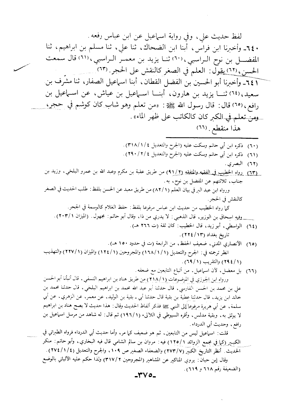 641 - وَأَخْبَرَنَا أَبُو الْحُسَيْنِ بْنُ الْفَضْلِ الْقَطَّانُ، أبنا إِسْمَاعِيلُ الصَّفَّارُ، ثنا مُشْرِفُ بْنُ سَعِيدٍ، ثنا يَزِيدُ بْنُ هَارُونَ، أبنا إِسْمَاعِيلُ بْنُ عَيَّاشٍ، عَنْ إِسْمَاعِيلَ بْنِ رَافِعٍ، قَالَ: قَالَ رَسُولُ اللَّهِ صَلَّى اللهُ عَلَيْهِ وَسَلَّمَ: «§مَنْ تَعَلَّمَ وَهُوَ شَابٌّ كَانَ كَوَشْمٍ فِي حَجَرٍ، وَمَنْ تَعَلَّمَ فِي الْكِبْرِ كَانَ كَالْكَاتِبِ عَلَى ظَهْرِ الْمَاءِ» هَذَا مُنْقَطِعٌ
