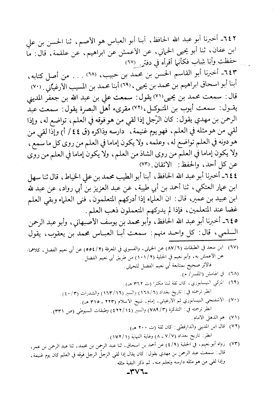 643 - أَخْبَرَنَا أَبُو الْقَاسِمِ الْحَسَنُ بْنُ مُحَمَّدِ بْنِ حَبِيبٍ، مِنْ أَصْلِ كِتَابِهِ أبنا أَبُو إِسْحَاقَ إِبْرَاهِيمُ بْنُ مُحَمَّدِ بْنِ يَحْيَى، أبنا مُحَمَّدُ بْنُ الْمُسَيَّبِ الْأَرْغِيَانِيُّ، قَالَ: سَمِعْتُ مُحَمَّدَ بْنَ يَحْيَى، يَقُولُ: سَمِعْتُ عَلِيَّ بْنَ عَبْدِ اللَّهِ بْنِ جَعْفَرٍ الْمَدِينِيَّ، يَقُولُ: سَمِعْتُ أَيُّوبَ بْنَ الْمُتَوَكِّلِ، مُقْرِئُ أَهْلِ الْبَصْرَةِ يَقُولُ: سَمِعْتُ عَبْدَ الرَّحْمَنِ بْنَ مَهْدِيٍّ، يَقُولُ: كَانَ §الرَّجُلُ إِذَا لَقِيَ مَنْ هُوَ فَوْقَهُ فِي الْعِلْمِ تَوَاضَعَ لَهُ، وَإِذَا لَقِيَ مَنْ هُوَ مِثْلَهُ فِي الْعِلْمِ فَهُوَ يَوْمُ غَنِيمَةٍ، دَارَسَهُ وَذَاكَرَهُ، وَإِذَا لَقِيَ مَنْ هُوَ دُونَهُ فِي الْعِلْمِ تَوَاضَعَ لَهُ وَعَلَّمَهُ وَلَا يَكُونُ إِمَامًا فِي الْعِلْمِ مَنْ رَوَى كُلَّ مَا سَمِعَ، وَلَا يَكُونُ إِمَامًا فِي الْعِلْمِ مَنْ رَوَى الشَّاذَّ مِنَ الْعِلْمِ، وَلَا يَكُونُ إِمَامًا فِي الْعِلْمِ مَنْ رَوَى عَنْ كُلِّ أَحَدٍ، وَالْحِفْظُ الْإِتْقَانُ