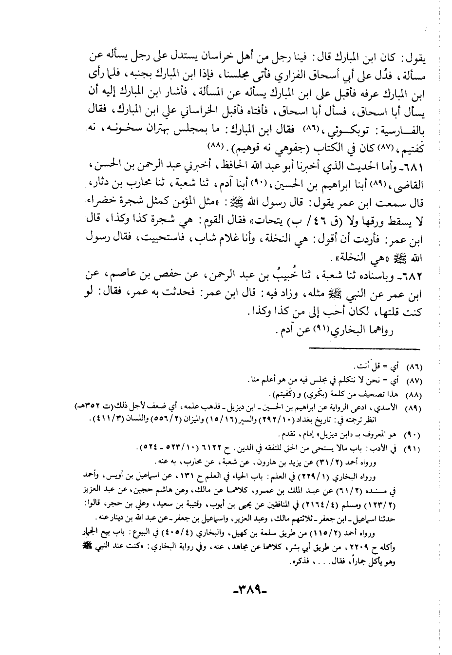 681 - وَأَمَّا الْحَدِيثُ الَّذِي أَخْبَرَنَا أَبُو عَبْدِ اللَّهِ الْحَافِظُ، أَخْبَرَنِي عَبْدُ الرَّحْمَنِ بْنُ الْحَسَنِ الْقَاضِي، أبنا إِبْرَاهِيمُ بْنُ الْحُسَيْنِ، أبنا آدَمُ، ثنا شُعْبَةُ، ثنا مُحَارِبُ بْنُ دِثَارٍ، قَالَ: سَمِعْتُ ابْنَ عُمَرَ، يَقُولُ: قَالَ رَسُولُ اللَّهِ صَلَّى اللهُ عَلَيْهِ وَسَلَّمَ: §«مَثَلُ الْمُؤْمِنِ كَمَثَلِ شَجَرَةٍ خَضْرَاءَ لَا يَسْقُطُ وَرَقُهَا وَلَا يَتَحَاتُّ» ، فَقَالَ الْقَوْمُ: هِيَ شَجَرَةُ كَذَا وَكَذَا، قَالَ ابْنُ عُمَرَ: فَأَرَدْتُ أَنْ أَقُولَ هِيَ النَّخْلَةُ وَأَنَا غُلَامٌ شَابٌّ فَاسْتَحْيَيْتُ، فَقَالَ رَسُولُ اللَّهِ صَلَّى اللهُ عَلَيْهِ وَسَلَّمَ: «هِيَ النَّخْلَةُ» ،