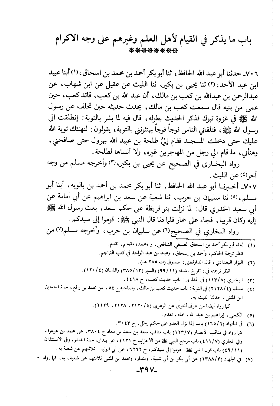 708 - أبنا أَبُو عَبْدِ اللَّهِ الْحَافِظُ، قَالَ: سَمِعْتُ مُحَمَّدَ بْنَ إِبْرَاهِيمَ الْهَاشِمِيَّ، يَقُولُ: سَمِعْتُ أَحْمَدَ بْنَ سَلَمَةَ، يَقُولُ: سَمِعْتُ مُسْلِمَ بْنَ الْحَجَّاجِ، يَقُولُ: «لَا أَعْلَمُ فِي قِيَامِ الرَّجُلِ لِلرَّجُلِ حَدِيثًا أَصَحَّ مِنْ هَذَا وَهَذَا الْقِيَامُ عَلَى وَجْهِ الْبِرِّ لَا عَلَى وَجْهِ التَّعْظِيمِ، أَمَرَ رَسُولُ اللَّهِ صَلَّى اللهُ عَلَيْهِ وَسَلَّمَ الْأَنْصَارَ أَنْ يَقُومُوا إِلَى سَيِّدِهُمْ»
