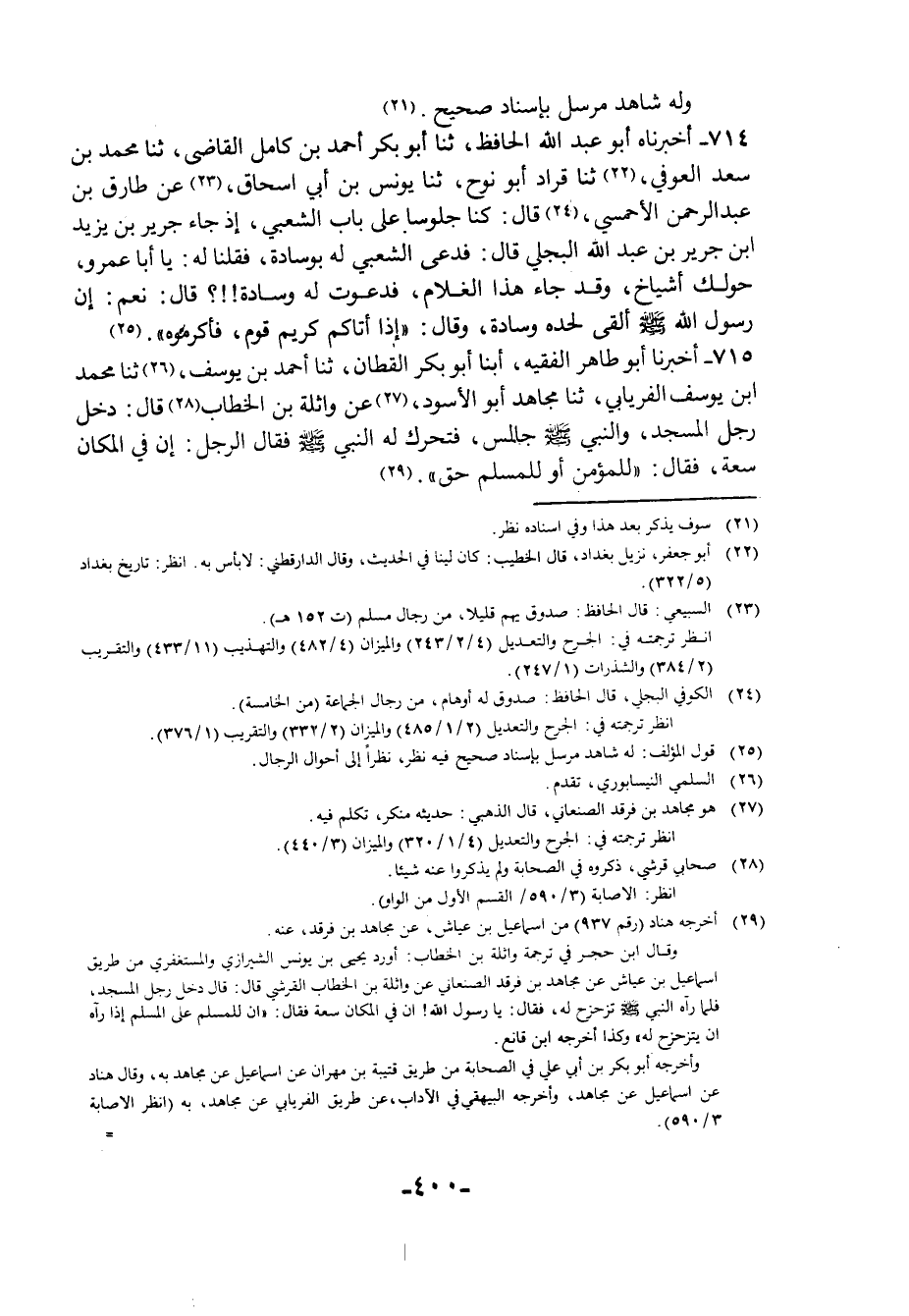 715 - أَخْبَرَنَا أَبُو طَاهِرٍ الْفَقِيهُ، أبنا أَبُو بَكْرٍ الْقَطَّانُ، ثنا أَحْمَدُ بْنُ يُوسُفَ، ثنا مُحَمَّدُ بْنُ يُوسُفَ الْفِرْيَابِيُّ، ثنا مُجَاهِدٌ أَبُو الْأَسْوَدِ، عَنْ وَاثِلَةَ بْنِ الْخَطَّابِ، قَالَ: دَخَلَ رَجُلٌ الْمَسْجِدَ وَالنَّبِيُّ صَلَّى اللهُ عَلَيْهِ وَسَلَّمَ جَالِسٌ فَتَحَرَّكَ لَهُ النَّبِيُّ صَلَّى اللهُ عَلَيْهِ وَسَلَّمَ فَقَالَ الرَّجُلُ: §إِنَّ فِي الْمَكَانِ سِعَةً. فَقَالَ: «لِلْمُؤْمِنِ أَوْ لِلْمُسْلِمِ حَقُّ»