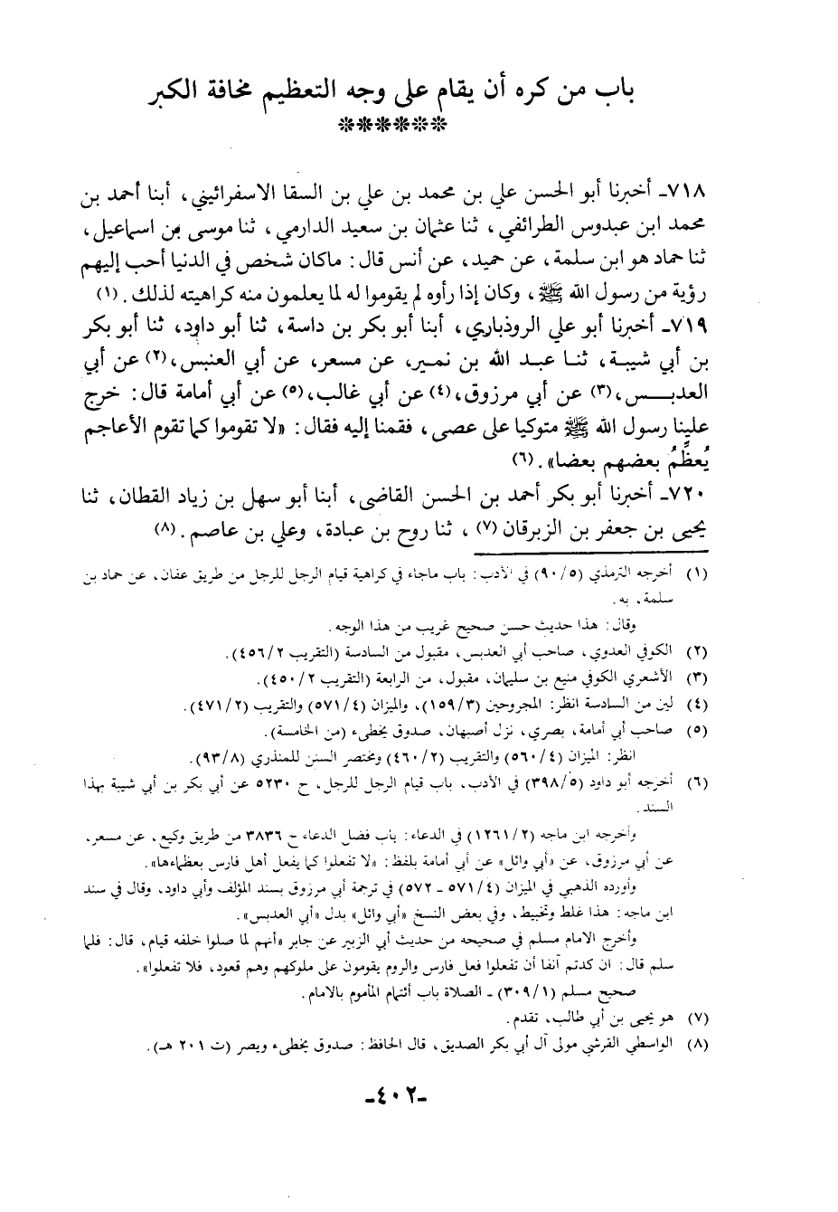 718 - أَخْبَرَنَا أَبُو الْحَسَنِ عَلِيُّ بْنُ مُحَمَّدِ بْنِ عَلِيِّ بْنِ السَّقَّا الْإِسْفَرَايِينِيُّ أبنا أَحْمَدُ بْنُ مُحَمَّدِ بْنِ عَبْدُوسٍ الطَّرَائِفِيُّ، ثنا عُثْمَانُ بْنُ سَعِيدٍ الدَّارِمِيُّ، ثنا مُوسَى بْنُ إِسْمَاعِيلَ، ثنا حَمَّادٌ هُوَ ابْنُ سَلَمَةَ عَنْ حُمَيْدٍ، عَنْ أَنَسٍ، قَالَ: §«مَا كَانَ شَخْصٌ فِي الدُّنْيَا أَحَبُّ إِلَيْهِمْ رُؤْيَةً مِنْ رَسُولِ اللَّهِ صَلَّى اللهُ عَلَيْهِ وَسَلَّمَ وَكَانَ إِذَا رَأَوْهُ لَمْ يَقُومُوا لَهُ لِمَا يَعْلَمُونَ مِنْهُ كَرَاهِيَّتَهُ لِذَلِكَ»