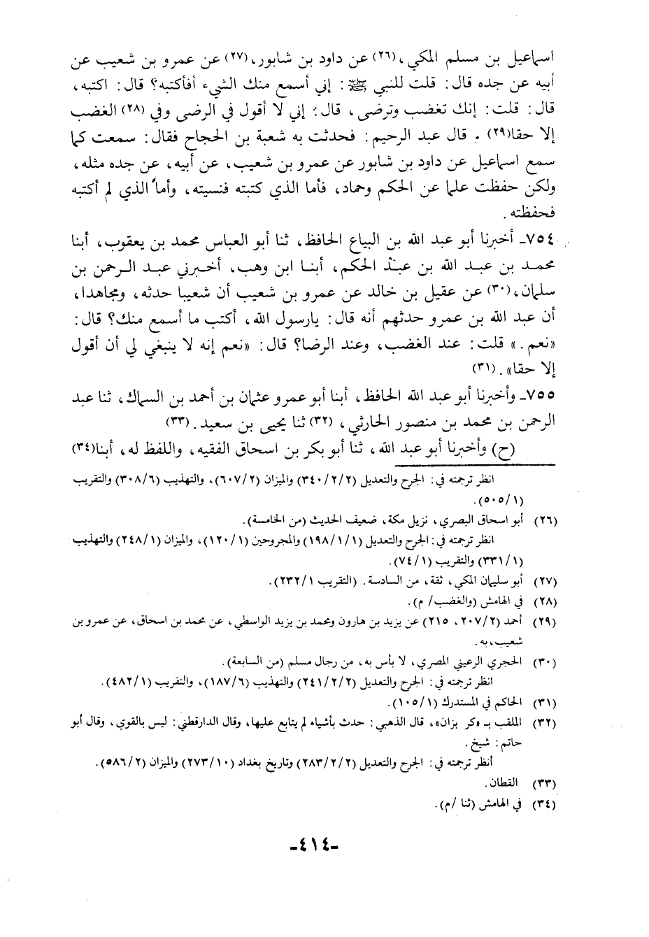 754 - أَخْبَرَنَا أَبُو عَبْدِ اللَّهِ بْنِ الْبَيَّاعِ الْحَافِظُ، ثنا أَبُو الْعَبَّاسِ مُحَمَّدُ بْنُ يَعْقُوبَ أبنا مُحَمَّدُ بْنُ عَبْدِ اللَّهِ بْنِ عَبْدِ الْحَكَمِ، أبنا ابْنُ وَهْبٍ، أَخْبَرَنِي عَبْدُ الرَّحْمَنِ بْنُ سَلْمَانَ، عَنْ عَقِيلِ بْنِ خَالِدٍ، عَنْ عَمْرِو بْنِ شُعَيْبٍ، أَن شُعَيْبًا، حَدَّثَهُ وَمُجَاهِدًا، أَنَّ عَبْدَ اللَّهِ بْنَ عَمْرٍو حَدَّثَهُمْ أَنَّهُ قَالَ: يَا رَسُولَ اللَّهِ أَكْتُبُ مَا أَسْمَعُ مِنْكَ قَالَ: «نَعَمْ» قُلْتُ: §عِنْدَ الْغَضَبِ وَعِنْدَ الرِّضَى؟ قَالَ: «نَعَمْ إِنَّهُ لَا يَنْبَغِي لِي أَنْ أَقُولَ إِلَّا حَقًّا»