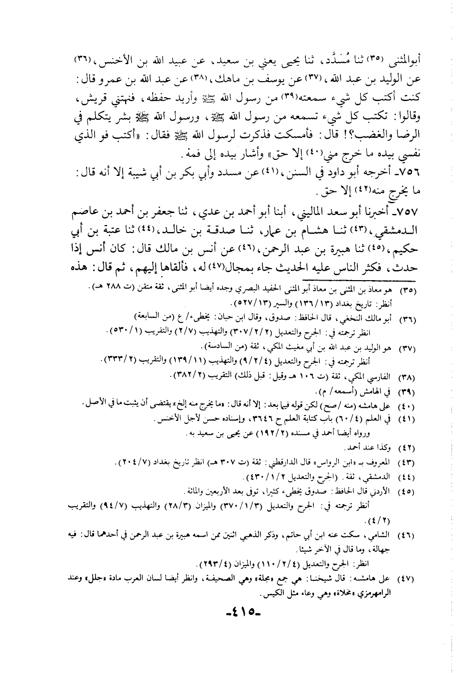 757 - أَخْبَرَنَا أَبُو سَعْدٍ الْمَالِينِيُّ، أبنا أَبُو أَحْمَدَ بْنُ عَدِيٍّ، ثنا جَعْفَرُ بْنُ أَحْمَدَ بْنِ عَاصِمٍ الدِّمَشْقِيُّ، ثنا هِشَامُ بْنُ عَمَّارٍ، ثنا صَدَقَةُ بْنُ خَالِدٍ، ثنا عُتْبَةُ بْنُ أَبِي حَكِيمٍ، ثنا هُبَيْرَةُ بْنُ عَبْدِ الرَّحْمَنِ، عَنْ أَنَسِ بْنِ مَالِكٍ، قَالَ: كَانَ أَنَسٌ إِذَا حَدَّثَ فَكَثُرَ النَّاسُ، عَلَيْهِ الْحَدِيثَ جَاءَ بِمَجَالٍ لَهُ فَأَلْقَاهَا إِلَيْهِمْ ثُمَّ قَالَ: §«هَذِهِ أَحَادِيثُ سَمِعْتُهَا وَكَتَبْتُهَا عَنْ رَسُولِ اللَّهِ صَلَّى اللهُ عَلَيْهِ وَسَلَّمَ ثُمَّ عَرَضْتُهَا عَلَيْهِ»