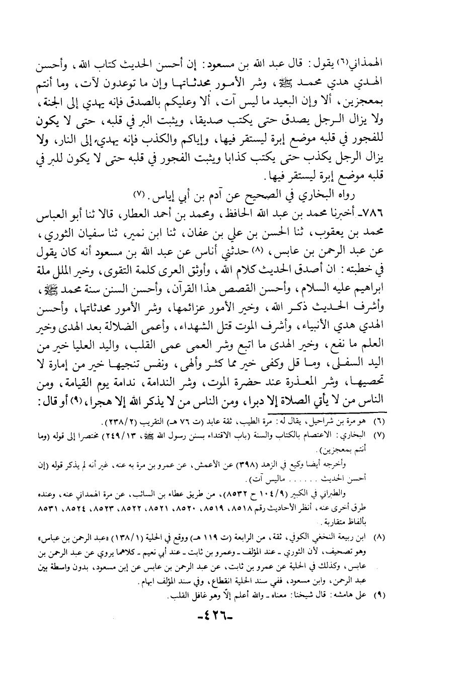 786 - أَخْبَرَنَا مُحَمَّدُ بْنُ عَبْدِ اللَّهِ الْحَافِظُ، وَمُحَمَّدُ بْنُ أَحْمَدَ الْعَطَّارُ، قَالَا: ثنا أَبُو الْعَبَّاسِ مُحَمَّدُ بْنُ يَعْقُوبَ ثنا الْحَسَنُ بْنُ عَلِيِّ بْنِ عَفَّانَ، ثنا ابْنُ نُمَيْرٍ، ثنا سُفْيَانُ الثَّوْرِيُّ، عَنْ عَبْدِ الرَّحْمَنِ بْنِ عَابِسٍ، حَدَّثَنِي أُنَاسٌ، عَنْ عَبْدِ اللَّهِ بْنِ مَسْعُودٍ، أَنَّهُ كَانَ يَقُولُ فِي خُطْبَتِهِ: " §إِنَّ أَصْدَقَ الْحَدِيثِ كَلَامُ اللَّهِ، وَأَوْثَقَ الْعُرَى كَلِمَةُ التَّقْوَى، وَخَيْرَ الْمِلَلِ مِلَّةُ إِبْرَاهِيمَ عَلَيْهِ السَّلَامُ، وَأَحْسَنَ الْقَصَصِ هَذَا الْقُرْآنُ، وَأَحْسَنَ السُّنَنِ سُنَّةُ مُحَمَّدٍ صَلَّى اللهُ عَلَيْهِ وَسَلَّمَ، وَأَشْرَفَ الْحَدِيثِ ذِكْرُ اللَّهِ، وَخَيْرَ الْأُمُورِ عَزَائِمُهَا، وَشَرَّ الْأُمُورِ مُحْدَثَاتُهَا، وَأَحْسَنَ الْهَدْي هَدْيُ الْأَنْبِيَاءِ، وَأَشْرَفَ الْمَوْتِ قَتْلُ الشُّهَدَاءِ، وَأَعْمَى الضَّلَالَةِ بَعْدَ الْهُدَى، وَخَيْرَ الْعِلْمِ مَا نَفَعَ، وَخَيْرَ الْهُدَى مَا اتَّبَعَ، وَشَرَّ الْعَمَى عَمَى الْقَلْبِ، وَالْيَدَ الْعُلْيَا خَيْرٌ مِنَ الْيَدِ السُّفْلَى، وَمَا قَلَّ وَكَفَى خَيْرٌ مِمَّا كَثُرَ وَأَلْهَى، وَنَفْسًا تُنْجِيهَا خَيْرٌ مِنْ إِمَارَةٍ لَا تُحْصِيهَا، وَشَرَّ الْمَعْذِرَةِ عِنْدَ حَضْرَةِ الْمَوْتِ، وَشَرَّ النَّدَامَةِ نَدَامَةُ يَوْمِ الْقِيَامَةِ، وَمِنَ النَّاسِ مَنْ لَا يَأْتِي الصَّلَاةَ إِلَّا دُبُرًا، وَمِنَ النَّاسِ مَنْ لَا يَذْكُرُ اللَّهَ إِلَّا هُجْرًا أَوْ قَالَ -[427]- مُهَاجِرًا، وَأَعْظَمَ الْخَطَايَا اللِّسَانُ الْكَذُوبُ، وَخَيْرَ الْغِنَى غِنَى النَّفْسِ، وَخَيْرَ الزَّادِ التَّقْوَى، وَرَأْسَ الْحِكْمَةِ مَخَافَةُ اللَّهِ عَزَّ وَجَلَّ، وَخَيْرَ مَا أُلْقِيَ فِي الْقَلْبِ الْيقِينُ، وَالرِّيبَ مِنَ الْكُفْرِ، وَالنَّوْحَ مِنْ عَمَلِ الْجَاهِلِيَّةِ، وَالْغُلُوَّ مِنْ حُجْرِ جَهَنَّمَ، وَالْكَنْزَ كَيٌّ مِنَ النَّارِ، وَالشِّعْرَ مِنْ مَزَامِيرِ إِبْلِيسَ، وَالْخَمْرَ جِمَاعُ الْإِثْمِ، وَالنِّسَاءَ حَبَائِلُ الشَّيْطَانِ، وَالشَّبَابَ شُعْبَةٌ مِنَ الْجُنُونِ، وَشَرَّ الْمَكَاسِبِ كَسْبُ الرِّبَا، وَشَرَّ الْمَآكِلِ أَكَلُ مَالِ الْيَتِيمِ، وَالسَّعِيدَ مَنْ وُعِظَ بِغَيْرِهِ، وَالشَّقِيَّ مَنْ شَقِيَ فِي بَطْنِ أُمِّهِ، وَإِنَّمَا يَكْفِي أَحَدُكُمْ مَا قَنَعَتْ بِهِ نَفْسُهُ، وَإِنَّمَا يَصِيرُ إِلَى مَوْضِعِ أَرْبَعَةِ أَذْرُعٍ، وَالْأَمْرُ بِآخِرِهِ، أَمْلَكَ الْعَمَلِ بِهِ خَوَاتِيمُهُ، وَشَرَّ الرَّوَايَا رَوَايَا الْكَذِبِ، وَكُلَّ مَا هُوَ آتٍ قَرِيبٌ، وَسِبَابَ الْمُسْلِمِ فُسُوقٌ وَقِتَالَهُ كُفْرٌ، وَأَكْلَ مَالِهِ مِنْ مَعَاصِي اللَّهِ، وَحُرْمَةَ مَالِهِ كَحُرْمَةِ دَمِهِ، وَمَنْ تَقَالَّ عَلَى اللَّهِ يُكَذِّبْهُ، وَمَنْ يَغْفِرْ يَغْفِرِ اللَّهُ لَهُ، وَمَنْ يَعْفُ يَعْفُ اللَّهُ عَنْهُ، وَمَنْ يَكْظِمِ الْغَيْظَ يَأْجُرْهُ اللَّهُ، وَمَنْ يَصْبِرْ عَلَى الرَّزَايَا يُعْقِبْهُ اللَّهُ، وَمَنْ يَعْرِفِ الْبَلَاءَ يَصْبِرْ عَلَيْهِ، وَمَنْ لَا يَعْرِفْهُ يُنْكِرْهُ، وَمَنْ يَسْتَكْبِرْ يَضَعْهُ اللَّهُ، وَمَنْ يبْتَغِ السُّمْعَةَ يُسَمِّعِ اللَّهُ بِهِ، وَمَنْ يَنْوِ الدُّنْيَا تُعْجِزْهُ، وَمَنْ يُطِعِ الشَّيْطَانَ يَعْصِ اللَّهَ، وَمَنْ يَعْصِ اللَّهَ يُعَذِّبْهُ. كَذَا قَالَ: خَيْرُ الْعَمَلِ مَا نَفَعَ "
