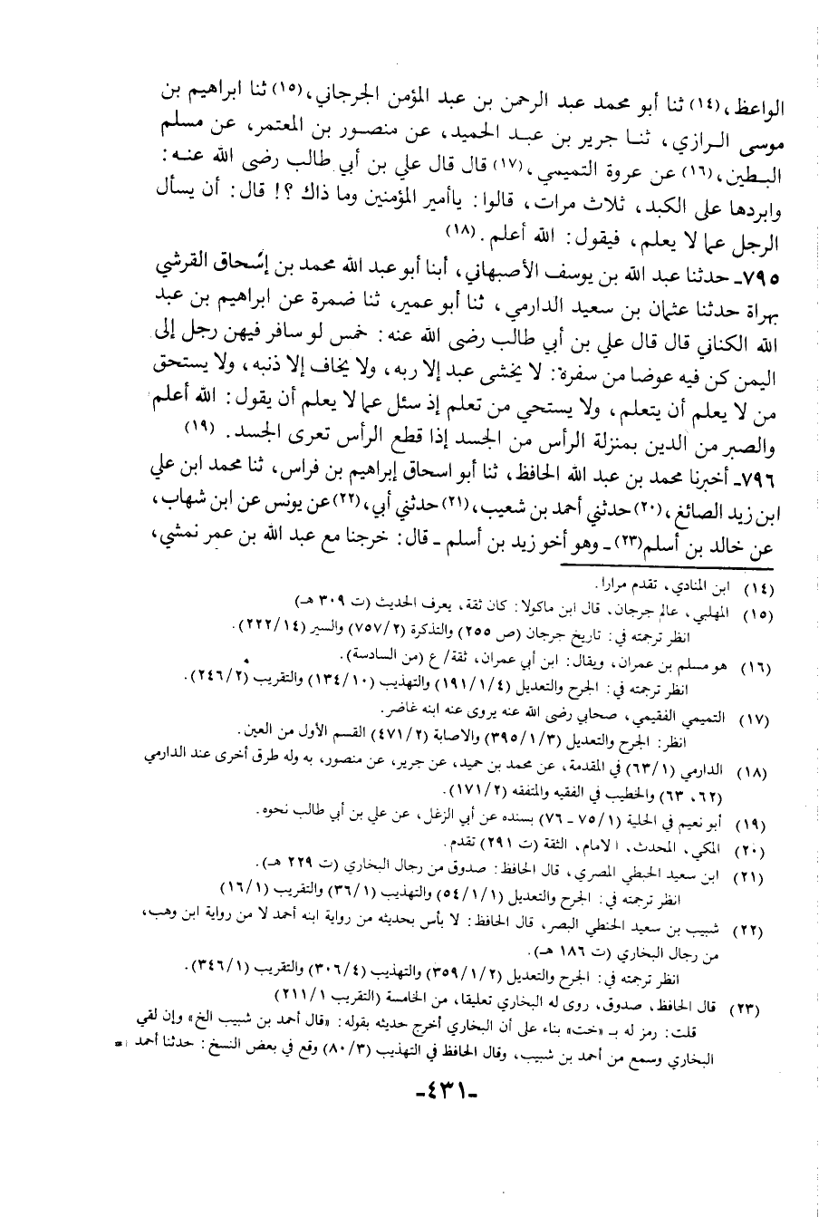 795 - حَدَّثَنَا عَبْدُ اللَّهِ بْنُ يُوسُفَ الْأَصْبَهَانِيُّ، أبنا أَبُو عَبْدِ اللَّهِ مُحَمَّدُ بْنُ إِسْحَاقَ الْقُرَشِيُّ بِهَرَاةَ حَدَّثَنَا عُثْمَانُ بْنُ سَعِيدٍ الدَّارِمِيُّ، ثنا أَبُو عُمَيْرٍ، ثنا ضَمْرَةُ، عَنْ إِبْرَاهِيمَ بْنِ عَبْدِ اللَّهِ الْكِنَانِيِّ، قَالَ: قَالَ عَلِيُّ بْنُ أَبِي طَالِبٍ رَضِيَ اللَّهُ عَنْهُ: §" خَمْسٌ لَوْ سَافَرَ فِيهِنَّ رَجُلٌ إِلَى الْيمَنِ كُنَّ فِيهِ عِوَضًا مِنْ سَفَرِهِ: لَا يَخْشَى عَبْدٌ إِلَّا رَبَّهُ، وَلَا يَخَافُ إِلَّا ذَنْبَهُ، وَلَا يَسْتَحْيِي مَنْ لَا يَعْلَمُ أَنْ يَتَعَلَّمَ، وَلَا يَسْتَحْيِي مَنْ تَعَلَّمَ إِذَا سُئِلَ عَمَّا لَا يَعْلَمُ أَنْ يَقُولَ: اللَّهُ أَعْلَمُ، وَالصَّبْرُ مِنَ الدِّينِ بِمَنْزِلَةِ الرَّأْسِ مِنَ الْجَسَدِ، إِذَا قُطِعَ الرَّأْسُ تَعَرَّى الْجَسَدُ "