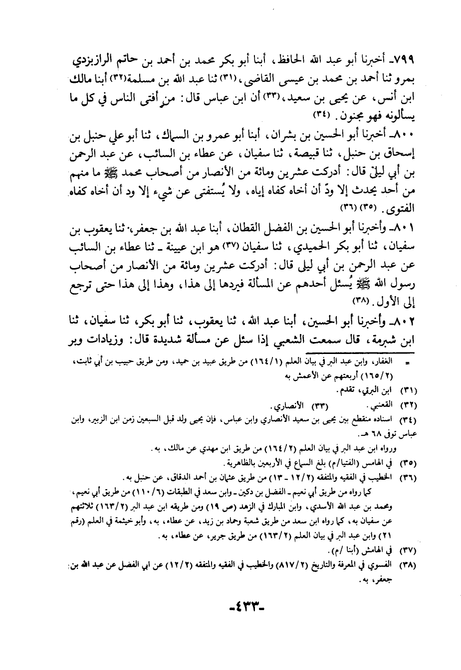 799 - أَخْبَرَنَا أَبُو عَبْدِ اللَّهِ الْحَافِظُ، أبنا أَبُو بَكْرٍ مُحَمَّدُ بْنُ أَحْمَدَ بْنِ حَاتِمٍ الدَّارَبَرْدِيُّ بِمَرْوَ ثنا أَحْمَدُ بْنُ مُحَمَّدِ بْنِ عِيسَى الْقَاضِي، ثنا عَبْدُ اللَّهِ بْنُ مَسْلَمَةَ، أبنا مَالِكُ بْنُ أَنَسٍ، عَنْ يَحْيَى بْنِ سَعِيدٍ، أَنَّ ابْنَ عَبَّاسٍ قَالَ: §«مَنْ أَفْتَى النَّاسَ فِي كُلِّ مَا يَسْأَلُونَهُ فَهُوَ مَجْنُونٌ»