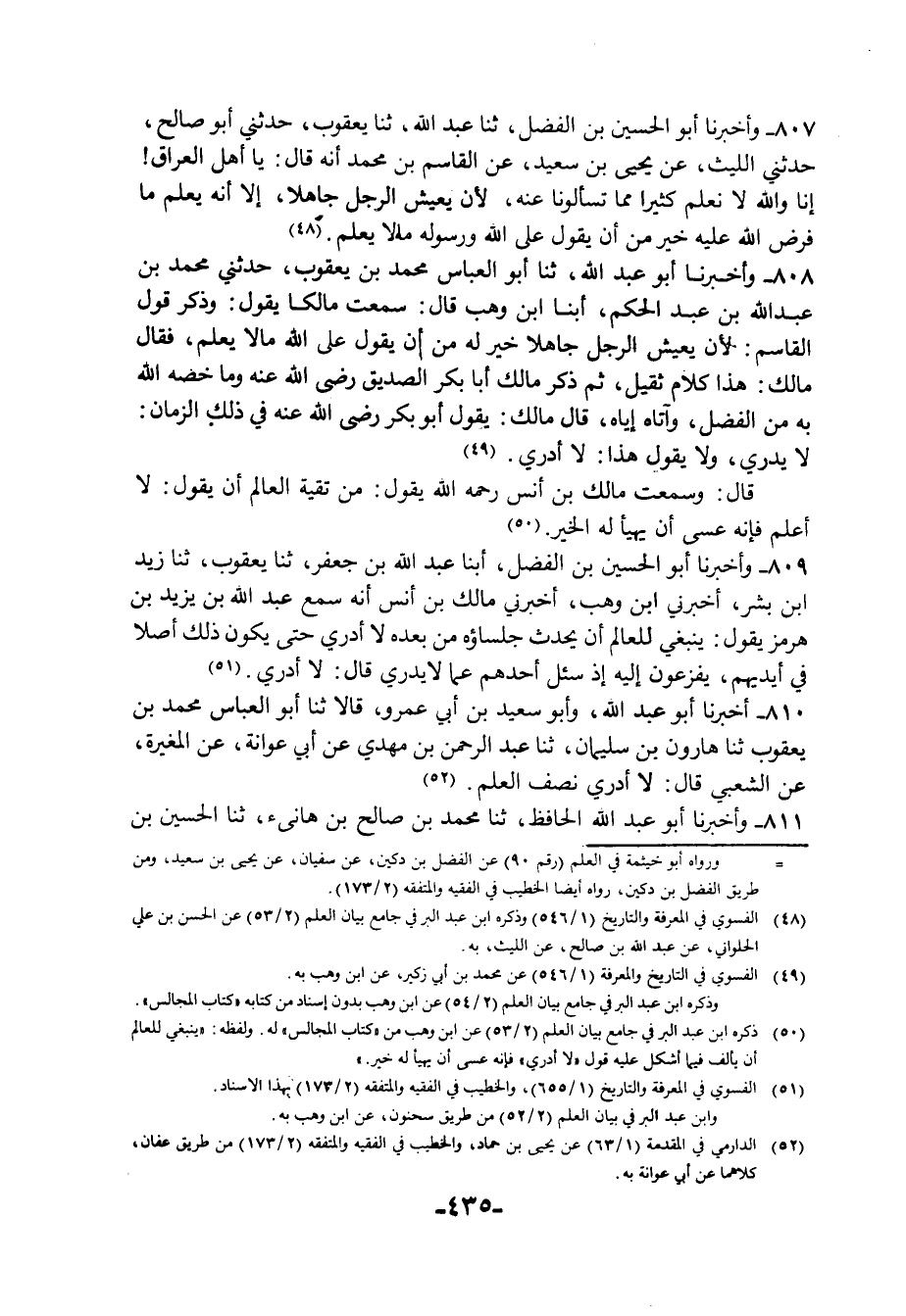 807 - وَأَخْبَرَنَا أَبُو الْحُسَيْنِ بْنُ الْفَضْلِ، ثنا عَبْدُ اللَّهِ، ثنا يَعْقُوبُ، حَدَّثَنِي أَبُو صَالِحٍ، حَدَّثَنِي اللَّيْثُ، عَنْ يَحْيَى بْنِ سَعِيدٍ، عَنِ الْقَاسِمِ بْنِ مُحَمَّدٍ، أَنَّهُ قَالَ: §يَا أَهْلَ الْعِرَاقِ، إِنَّا وَاللَّهِ لَا نَعْلَمُ كَثِيرًا مِمَّا تَسْأَلُونَا عَنْهُ لَأَنْ يَعِيشَ الرَّجُلُ جَاهِلًا إِلَّا أَنَّهُ يَعْلَمُ مَا فَرَضَ اللَّهُ عَلَيْهِ خَيْرٌ مِنْ أَنْ يَقُولَ عَلَى اللَّهِ وَرَسُولِهِ مَا لَا يَعْلَمُ "