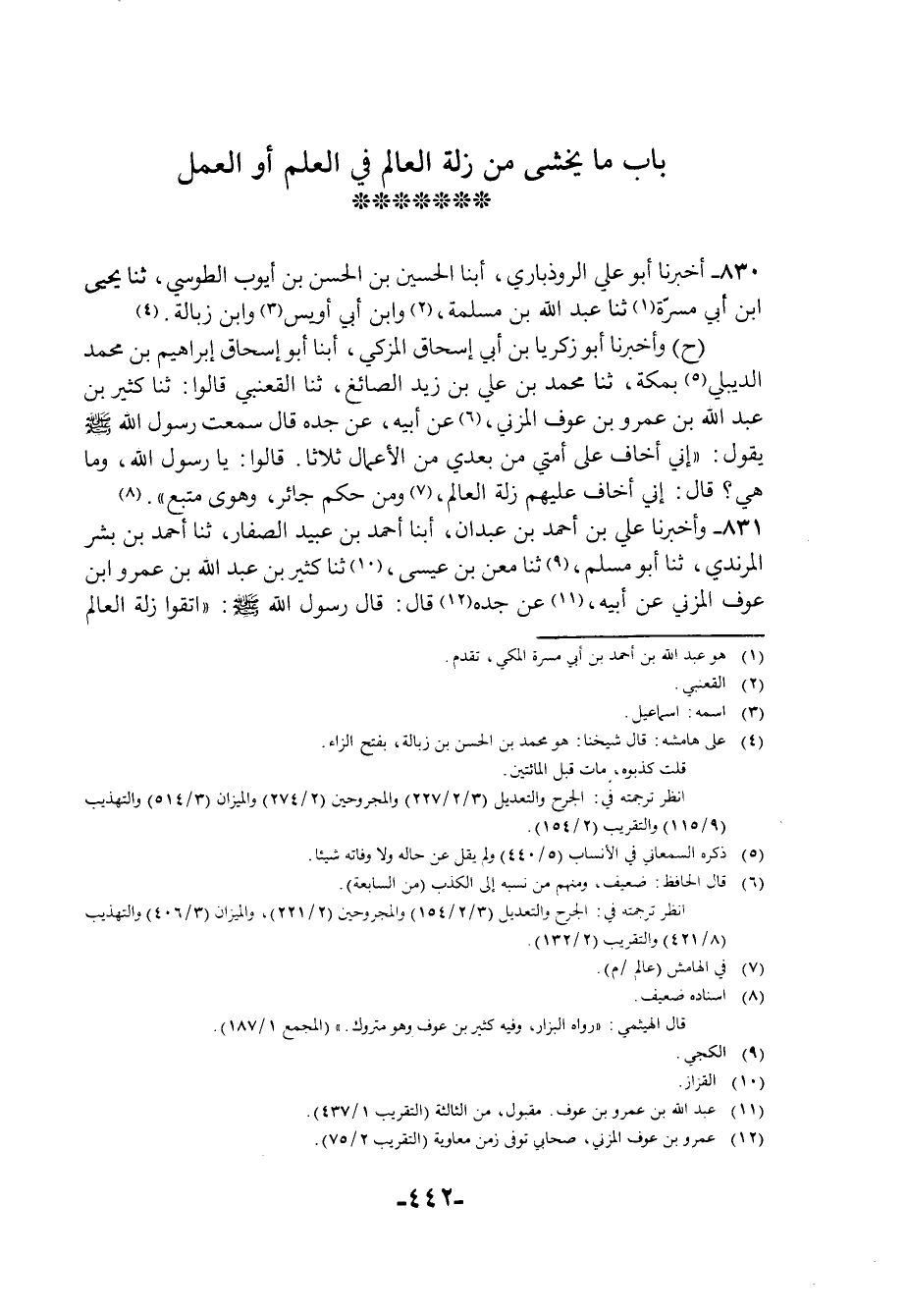 830 - أَخْبَرَنَا أَبُو عَلِيٍّ الرُّوذْبَارِيُّ، أبنا الْحُسَيْنُ بْنُ الْحَسَنِ بْنِ أَيُّوبَ الطُّوسِيُّ، ثنا يَحْيَى بْنُ أَبِي مَسَرَّةَ، ثنا عَبْدُ اللَّهِ بْنُ مَسْلَمَةَ، وَابْنُ أَبِي أُوَيْسٍ، وَابْنُ زَبَالَةَ، ح وَأَخْبَرَنَا أَبُو زَكَرِيَّا بْنُ أَبِي إِسْحَاقَ الْمُزَكِّي، أبنا أَبُو إِسْحَاقَ إِبْرَاهِيمُ بْنُ مُحَمَّدٍ الدَّيْبُلِيُّ بِمَكَّةَ ثنا مُحَمَّدُ بْنُ عَلِيِّ بْنِ زَيْدٍ الصَّائِغُ، ثنا الْقَعْنَبِيُّ، قَالُوا: ثنا كَثِيرُ بْنُ عَبْدِ اللَّهِ بْنِ عَمْرِو بْنِ عَوْفٍ الْمُزَنِيُّ، عَنْ أَبِيهِ، عَنْ جَدِّهِ، قَالَ: سَمِعْتُ رَسُولَ اللَّهِ صَلَّى اللهُ عَلَيْهِ وَسَلَّمَ يَقُولُ: §«إِنِّي أَخَافُ عَلَى أُمَّتِي مِنْ بَعْدِي مِنَ الْأَعْمَالِ ثَلَاثًا» قَالُوا: يَا رَسُولَ اللَّهِ، وَمَا هِيَ؟ قَالَ: «إِنِّي أَخَافُ عَلَيْهِمْ زَلَّةُ الْعَالِمِ، وَمِنْ حُكْمٍ جَائِرٍ، وَهَوًى مُتَّبِعٍ»