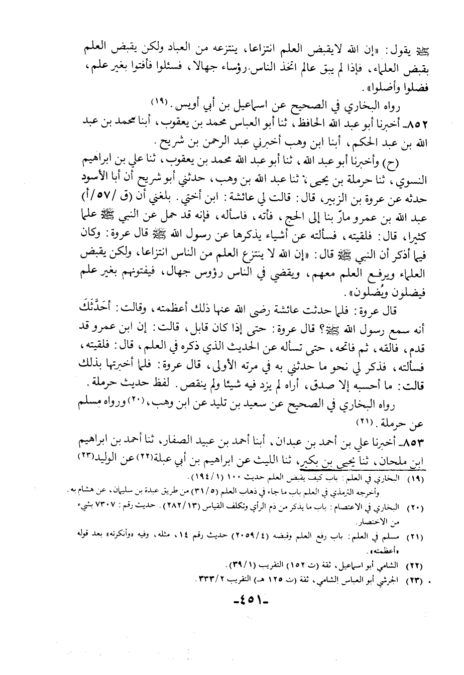 852 - أَخْبَرَنَا أَبُو عَبْدِ اللَّهِ الْحَافِظُ، ثنا أَبُو الْعَبَّاسِ مُحَمَّدُ بْنُ يَعْقُوبَ أبنا مُحَمَّدُ بْنُ عَبْدِ اللَّهِ بْنِ عَبْدِ الْحَكَمِ، أبنا ابْنُ وَهْبٍ، أَخْبَرَنِي عَبْدُ الرَّحْمَنِ بْنُ شُرَيْحٍ. ح وَأَخْبَرَنَا أَبُو عَبْدِ اللَّهِ، ثنا أَبُو عَبْدِ اللَّهِ مُحَمَّدُ بْنُ 63 يَعْقُوبَ ثنا عَلِيُّ بْنُ إِبْرَاهِيمَ النَّسَوِيُّ، ثنا حَرْمَلَةُ بْنُ يَحْيَى، ثنا عَبْدُ اللَّهِ بْنُ وَهْبٍ، حَدَّثَنِي أَبُو شُرَيْحٍ، أَنَّ أَبَا الْأَسْوَدِ، حَدَّثَهُ عَنْ عُرْوَةَ بْنِ الزُّبَيْرِ، قَالَ: قَالَتْ لِي عَائِشَةُ: ابْنَ أُخْتِي بَلَغَنِي أَنَّ عَبْدَ اللَّهِ بْنَ عَمْرٍو، مَارٌّ بِنَا إِلَى الْحَجِّ، فَأْتِهِ فَاسْأَلْهُ فَإِنَّهُ قَدْ حَمَلَ عَنِ النَّبِيِّ صَلَّى اللهُ عَلَيْهِ وَسَلَّمَ عِلْمًا كَثِيرًا قَالَ: فَلَقِيتُهُ فَسَأَلْتُهُ عَنْ أَشْيَاءَ يَذْكُرُهَا عَنْ رَسُولِ اللَّهِ صَلَّى اللهُ عَلَيْهِ وَسَلَّمَ قَالَ عُرْوَةُ: وَكَانَ فِيمَا أَذْكُرُ أَنَّ النَّبِيَّ صَلَّى اللهُ عَلَيْهِ وَسَلَّمَ قَالَ: «§إِنَّ اللَّهَ لَا يَنْتَزِعُ الْعِلْمَ مِنَ النَّاسِ انْتِزَاعًا، وَلَكِنْ يَقْبِضُ الْعُلَمَاءَ وَيُرْفَعُ الْعِلْمُ مَعَهُمْ وَيَقْضِي فِي النَّاسِ رُءوُسٌ جُهَّالٌ فَيَفْتُونَهُمْ بِغَيْرِ عِلْمٍ فَيُضِلُّونَ وَيَضِلُّونَ» قَالَ عُرْوَةُ: فَلَمَّا حَدَّثْتُ عَائِشَةَ رَضِيَ اللَّهُ عَنْهَا ذَلِكَ أَعْظَمَتْهُ وَقَالَتْ: أَحَدَّثَكَ أَنَّهُ سَمِعَ رَسُولَ اللَّهِ صَلَّى اللهُ عَلَيْهِ وَسَلَّمَ؟ قَالَ عُرْوَةُ: حَتَّى إِذَا كَانَ قَابِلٌ قَالَتْ: إِنَّ ابْنَ عَمْرٍو قَدْ قَدِمَ فَالْقَهُ ثُمَّ فَاتِحْهُ حَتَّى تَسْأَلَهُ عَنِ الْحَدِيثِ الَّذِي ذَكَرَهُ فِي الْعِلْمِ قَالَ: فَلَقِيتُهُ وَسَأَلْتُهُ فَذَكَرَ لِي نَحْوَ مَا حَدَّثَنِي بِهِ فِي مَرَّتِهِ الْأُولَى قَالَ عُرْوَةُ: فَلَمَّا أَخْبَرْتُهَا بِذَلِكَ قَالَتْ: مَا أَحْسِبُهُ إِلَّا صَدَقَ أُرَاهُ لَمْ يَزِدْ فِيهِ شَيْئًا وَلَمْ يُنْقِصْ لَفْظُ حَدِيثِ حَرْمَلَةَ رَوَاهُ الْبُخَارِيُّ فِي الصَّحِيحِ عَنْ سَعِيدِ بْنِ تَلِيدٍ عَنِ ابْنِ وَهْبٍ وَرَوَاهُ مُسْلِمٌ عَنْ حَرْمَلَةَ