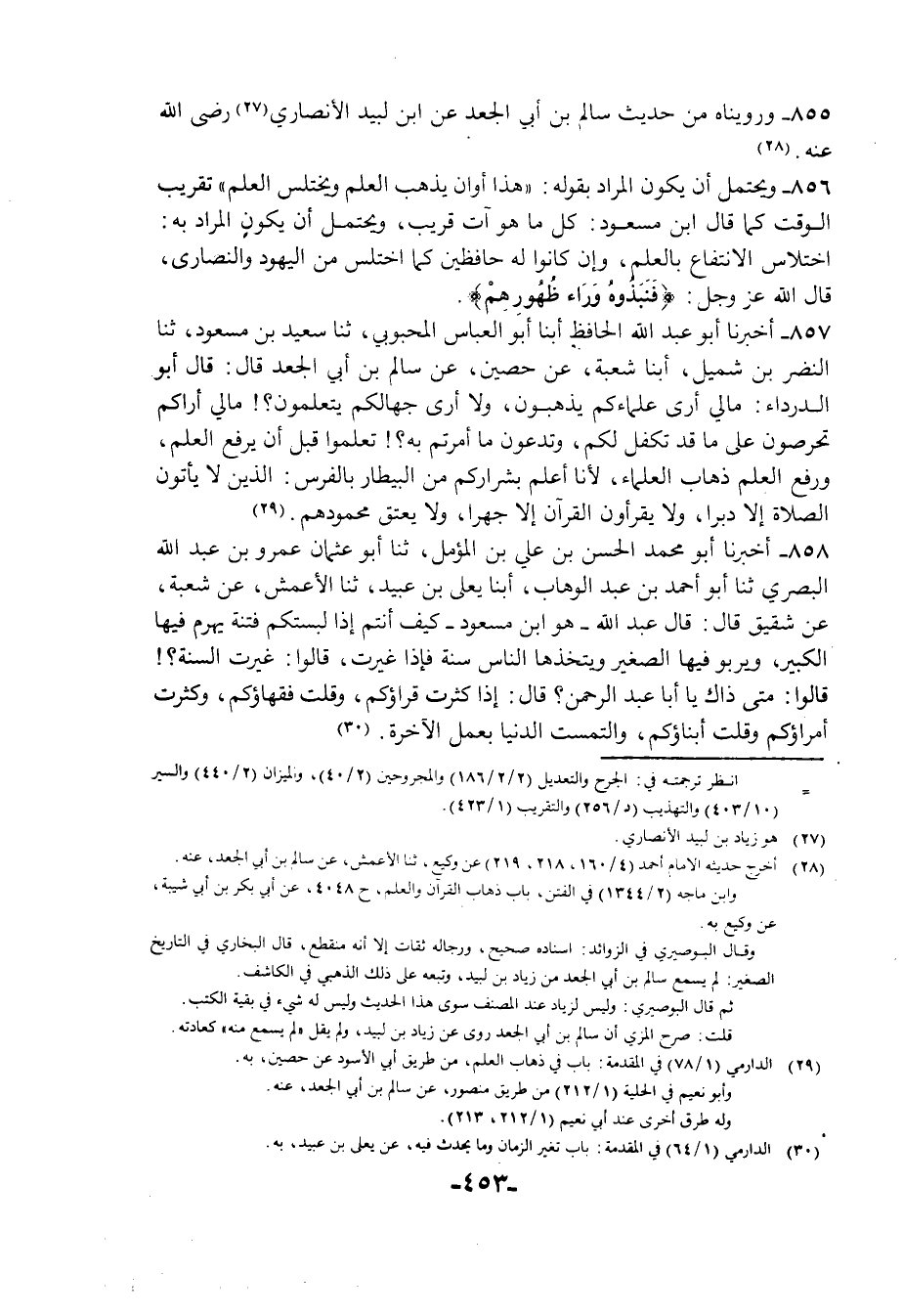 857 - أَخْبَرَنَا أَبُو عَبْدِ اللَّهِ الْحَافِظُ، أبنا أَبُو الْعَبَّاسِ الْمَحْبُوبِيُّ، ثنا سَعِيدُ بْنُ مَسْعُودٍ، ثنا النَّضْرُ بْنُ شُمَيْلٍ، أبنا شُعْبَةُ، عَنْ حُصَيْنٍ، عَنْ سَالِمِ بْنِ أَبِي الْجَعْدِ، قَالَ: قَالَ أَبُو الدَّرْدَاءِ: «§مَا لِي أَرَى عُلَمَاءَكُمْ يَذْهَبُونَ، وَلَا أَرَى جُهَّالَكُمْ يَتَعَلَّمُونَ، مَا لِي أَرَاكُمْ تَحْرُصُونَ عَلَى مَا قَدْ تُكُفِّلَ لَكُمْ وَتَدَعُونَ مَا أُمِرْتُمْ بِهِ، تَعَلَّمُوا قَبْلَ أَنْ يُرْفَعَ الْعِلْمُ، وَرَفْعُ الْعِلْمِ ذَهَابُ الْعُلَمَاءِ، لَأَنَا أَعْلَمُ بِشِرَارِكُمْ مِنَ الْبَيْطَارِ بِالْفَرَسِ الَّذِينَ لَا يَأْتُونَ الصَّلَاةَ إِلَّا دُبُرًا، وَلَا يَقْرَءُونَ الْقُرْآنَ إِلَّا جَهْرًا، وَلَا يُعْتَقُ مَحْمُودُهُمْ»