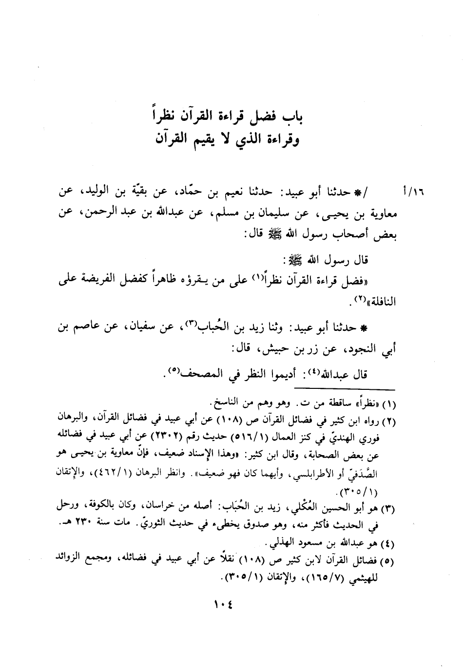 حَدَّثَنَا أَبُو عُبَيْدٍ حَدَّثَنَا نُعَيْمُ بْنُ حَمَّادٍ، عَنْ بَقِيَّةَ بْنِ الْوَلِيدِ، عَنْ مُعَاوِيَةَ بْنِ يَحْيَى، عَنْ سُلَيْمَانَ بْنِ مُسْلِمٍ، عَنْ عَبْدِ اللَّهِ بْنِ عَبْدِ الرَّحْمَنِ، عَنْ بَعْضِ أَصْحَابِ رَسُولِ اللَّهِ صَلَّى اللَّهُ عَلَيْهِ وَسَلَّمَ قَالَ: قَالَ رَسُولُ اللَّهِ صَلَّى اللَّهُ عَلَيْهِ وَسَلَّمَ: «§فَضْلُ قِرَاءَةِ الْقُرْآنِ نَظَرًا عَلَى مَنْ يَقْرَؤُهُ ظَاهِرًا كَفَضْلِ الْفَرِيضَةِ عَلَى النَّافِلَةِ»
