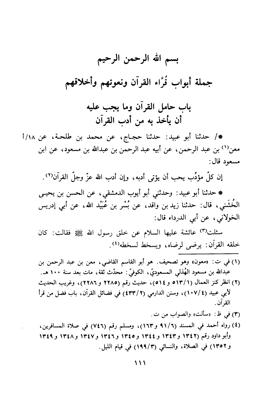 حَدَّثَنَا أَبُو عُبَيْدٍ حَدَّثَنَا حَجَّاجٌ، عَنْ مُحَمَّدِ بْنِ طَلْحَةَ، عَنْ مَعْنِ بْنِ عَبْدِ الرَّحْمَنِ، عَنْ أَبِيهِ عَبْدِ الرَّحْمَنِ بْنِ عَبْدِ اللَّهِ بْنِ مَسْعُودٍ، عَنِ ابْنِ مَسْعُودٍ، قَالَ: «§إِنَّ كُلَّ مُؤَدِّبٍ يُحِبُّ أَنْ يُؤْتَى أَدَبَهُ، وَإِنَّ أَدَبَ اللَّهِ عَزَّ وَجَلَّ الْقُرْآنُ»