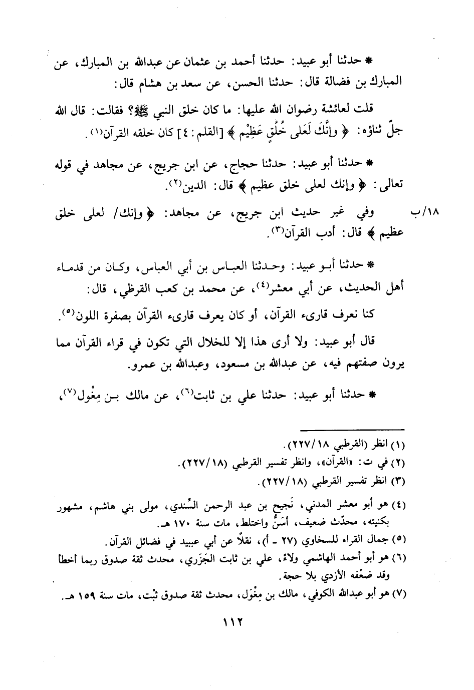 حَدَّثَنَا أَبُو عُبَيْدٍ حَدَّثَنَا أَحْمَدُ بْنُ عُثْمَانَ، عَنْ عَبْدِ اللَّهِ بْنِ الْمُبَارَكِ، عَنِ الْمُبَارَكِ بْنِ فَضَالَةَ، قَالَ: حَدَّثَنَا الْحَسَنُ، عَنْ سَعْدِ بْنِ هِشَامٍ، قَالَ: قُلْتُ لِعَائِشَةَ رِضْوَانُ اللَّهِ عَلَيْهَا: مَا كَانَ خُلُقُ النَّبِيِّ صَلَّى اللَّهُ عَلَيْهِ وَسَلَّمَ؟ فَقَالَتْ: " قَالَ اللَّهُ جَلَّ ثَنَاؤُهُ: {إِنَّكَ لَعَلَى خُلُقٍ عَظِيمٍ} [القلم: 4] ، §كَانَ خُلُقُهُ الْقُرْآنَ "