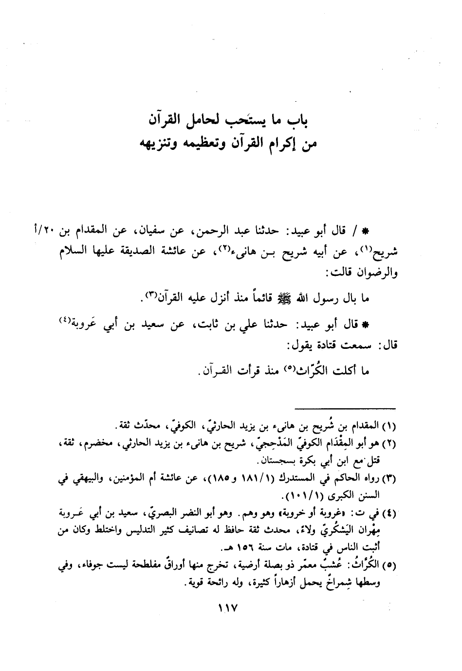 قَالَ أَبُو عُبَيْدٍ حَدَّثَنَا عَبْدُ الرَّحْمَنِ، عَنْ سُفْيَانَ، عَنِ الْمِقْدَامِ بْنِ شُرَيْحٍ، عَنْ أَبِيهِ شُرَيْحِ بْنِ هَانِئٍ، عَنْ عَائِشَةَ الصِّدِّيقَةِ، عَلَيْهَا السَّلَامُ وَالرِّضْوَانُ قَالَتْ: «§مَا بَالَ رَسُولُ اللَّهِ صَلَّى اللَّهُ عَلَيْهِ وَسَلَّمَ قَائِمًا مُنْذُ أُنْزِلَ عَلَيْهِ الْقُرْآنُ»