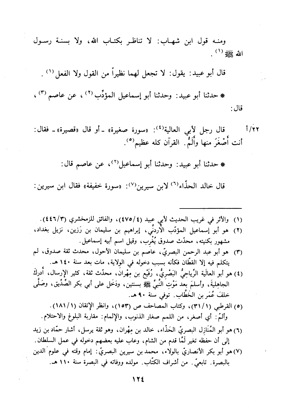 حَدَّثَنَا أَبُو عُبَيْدٍ وَحَدَّثَنَا أَبُو إِسْمَاعِيلَ الْمُؤَدِّبُ، عَنْ عَاصِمٍ، قَالَ: قَالَ رَجُلٌ لِأَبِي الْعَالِيَةِ: سُورَةٌ صَغِيرَةٌ أَوْ قَالَ: قَصِيرَةٌ. فَقَالَ: «§أَنْتَ أَصْغَرُ مِنْهَا وَأَلَمُّ، الْقُرْآنُ كُلُّهُ عَظِيمٌ»