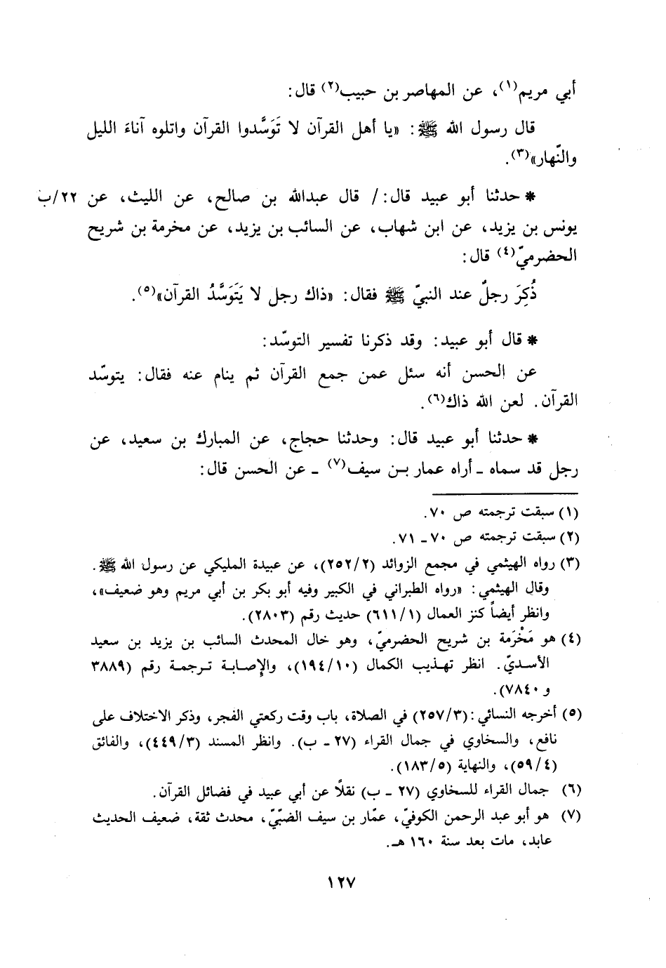 حَدَّثَنَا أَبُو عُبَيْدٍ قَالَ قَالَ عَبْدُ اللَّهِ بْنُ صَالِحٍ، عَنِ اللَّيْثِ، عَنْ يُونُسَ بْنِ يَزِيدَ، عَنِ ابْنِ شِهَابٍ، عَنِ السَّائِبِ بْنِ يَزِيدَ، عَنْ مَخْرَمَةَ بْنَ شُرَيْحٍ الْحَضْرَمِيِّ، قَالَ: ذُكِرَ رَجُلٌ عِنْدَ النَّبِيِّ صَلَّى اللَّهُ عَلَيْهِ وَسَلَّمَ فَقَالَ: «§ذَاكَ رَجُلٌ لَا يَتَوَسَّدُ الْقُرْآنَ» . قَالَ أَبُو عُبَيْدٍ: وَقَدْ ذَكَرْنَا تَفْسِيرَ التَّوَسُّدِ عَنِ الْحَسَنِ، أَنَّهُ سُئِلَ عَمَّنْ جَمَعَ الْقُرْآنَ ثُمَّ يَنَامُ عَنْهُ , فَقَالَ: يَتَوَسَّدُ الْقُرْآنَ , لَعَنَ اللَّهُ ذَاكَ