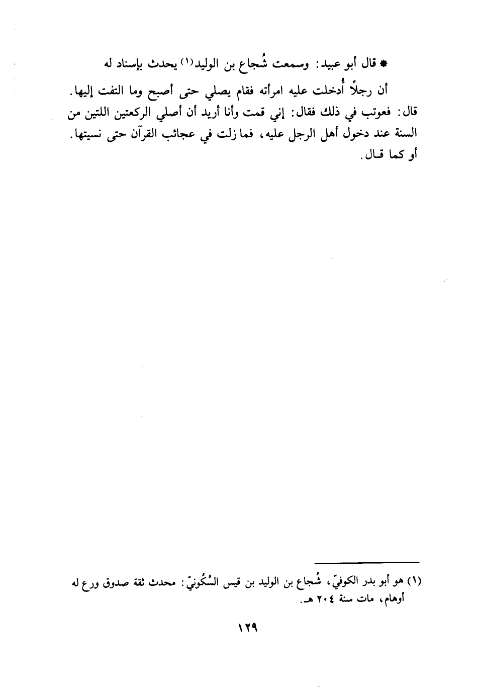 قَالَ أَبُو عُبَيْدٍ: وَسَمِعْتُ شُجَاعَ بْنَ الْوَلِيدِ، يُحَدِّثُ بِإِسْنَادٍ لَهُ أَنَّ رَجُلًا أُدْخِلَتْ عَلَيْهِ امْرَأَتُهُ فَقَامَ يُصَلِّي حَتَّى أَصْبَحَ وَمَا الْتَفَتَ إِلَيْهَا , قَالَ: فَعُوتِبَ فِي ذَلِكَ فَقَالَ: «§إِنِّي قُمْتُ وَأَنَا أُرِيدُ أَنْ أُصَلِّيَ الرَّكْعَتَيْنِ اللَّتَيْنِ مِنَ السُّنَّةِ عِنْدَ دُخُولِ أَهْلِ الرَّجُلِ عَلَيْهِ، فَمَا زِلْتُ فِي عَجَائِبِ الْقُرْآنِ حَتَّى نَسِيتُهَا» . أَوْ كَمَا قَالَ