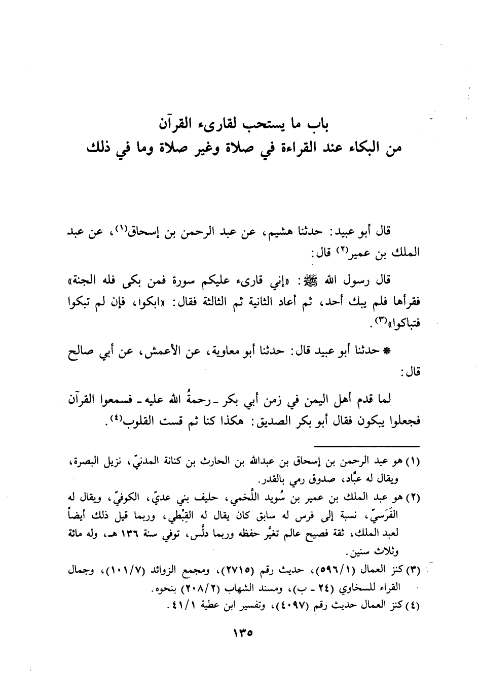 قَالَ أَبُو عُبَيْدٍ حَدَّثَنَا هُشَيْمٌ، عَنْ عَبْدِ الرَّحْمَنِ بْنِ إِسْحَاقَ، عَنْ عَبْدِ الْمَلِكِ بْنِ عُمَيْرٍ، قَالَ: قَالَ رَسُولُ اللَّهِ صَلَّى اللَّهُ عَلَيْهِ وَسَلَّمَ: «إِنِّي قَارِئٌ عَلَيْكُمْ سُورَةً , فَمَنْ بَكَى فَلَهُ الْجَنَّةَ» . فَقَرَأَهَا , فَلَمْ يَبْكِ أَحَدٌ، ثُمَّ أَعَادَ الثَّانِيَةَ ثُمَّ الثَّالِثَةَ فَقَالَ: «§ابْكُوا، فَإِنْ لَمْ تَبْكُوا فَتَبَاكَوْا»