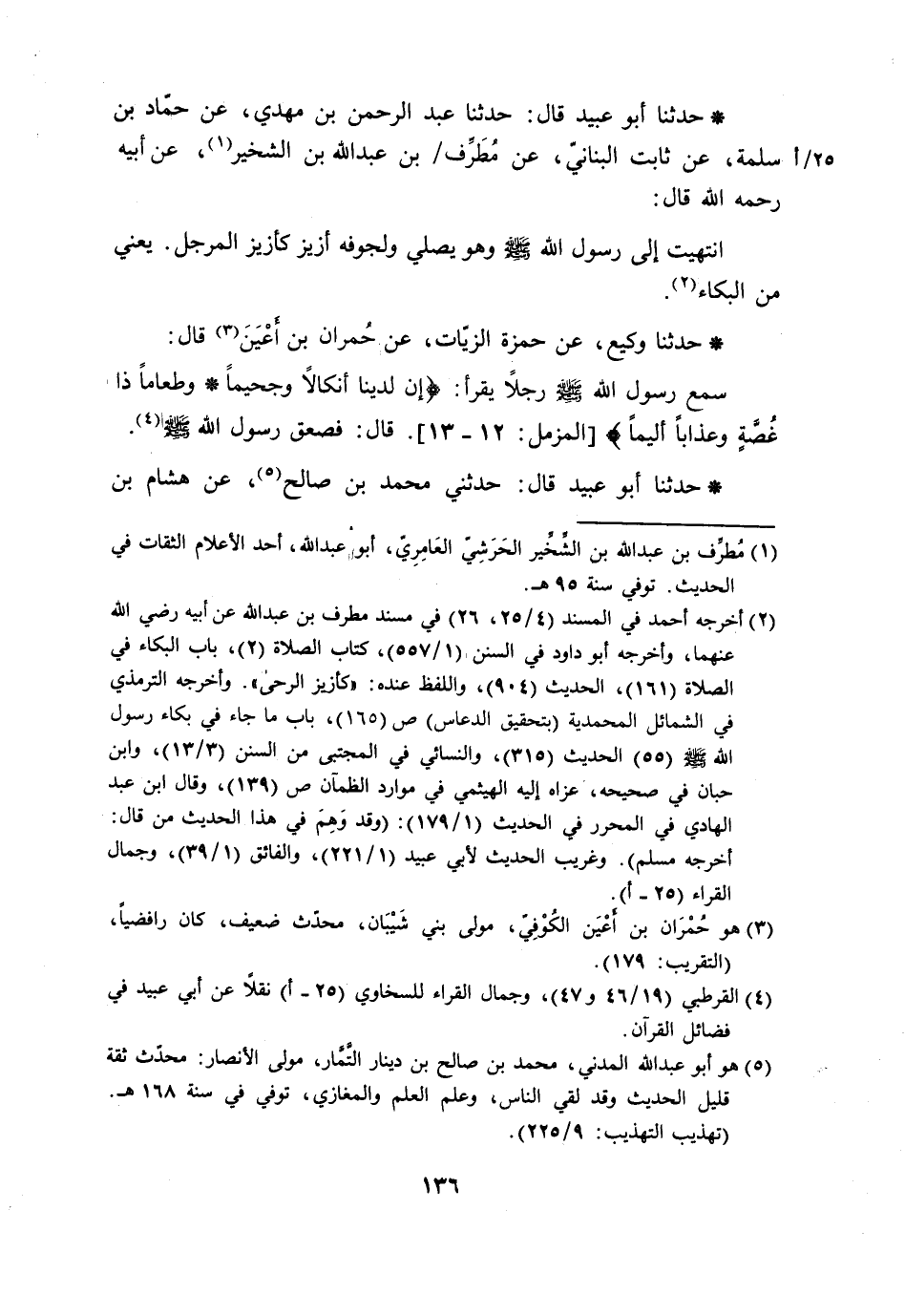حَدَّثَنَا أَبُو عُبَيْدٍ قَالَ حَدَّثَنَا عَبْدُ الرَّحْمَنِ بْنُ مَهْدِيٍّ، عَنْ حَمَّادِ بْنِ سَلَمَةَ، عَنْ ثَابِتٍ الْبُنَانِيِّ، عَنْ مُطَرِّفِ بْنِ عَبْدِ اللَّهِ بْنِ الشِّخِّيرِ، عَنْ أَبِيهِ، رَحِمَهُ اللَّهُ قَالَ: «§انْتَهَيْتُ إِلَى رَسُولِ اللَّهِ صَلَّى اللَّهُ عَلَيْهِ وَسَلَّمَ وَهُوَ يُصَلِّي، وَلِجَوْفِهِ أَزِيزٌ كَأَزِيزِ الْمِرْجَلِ» يَعْنِي مِنَ الْبُكَاءِ
