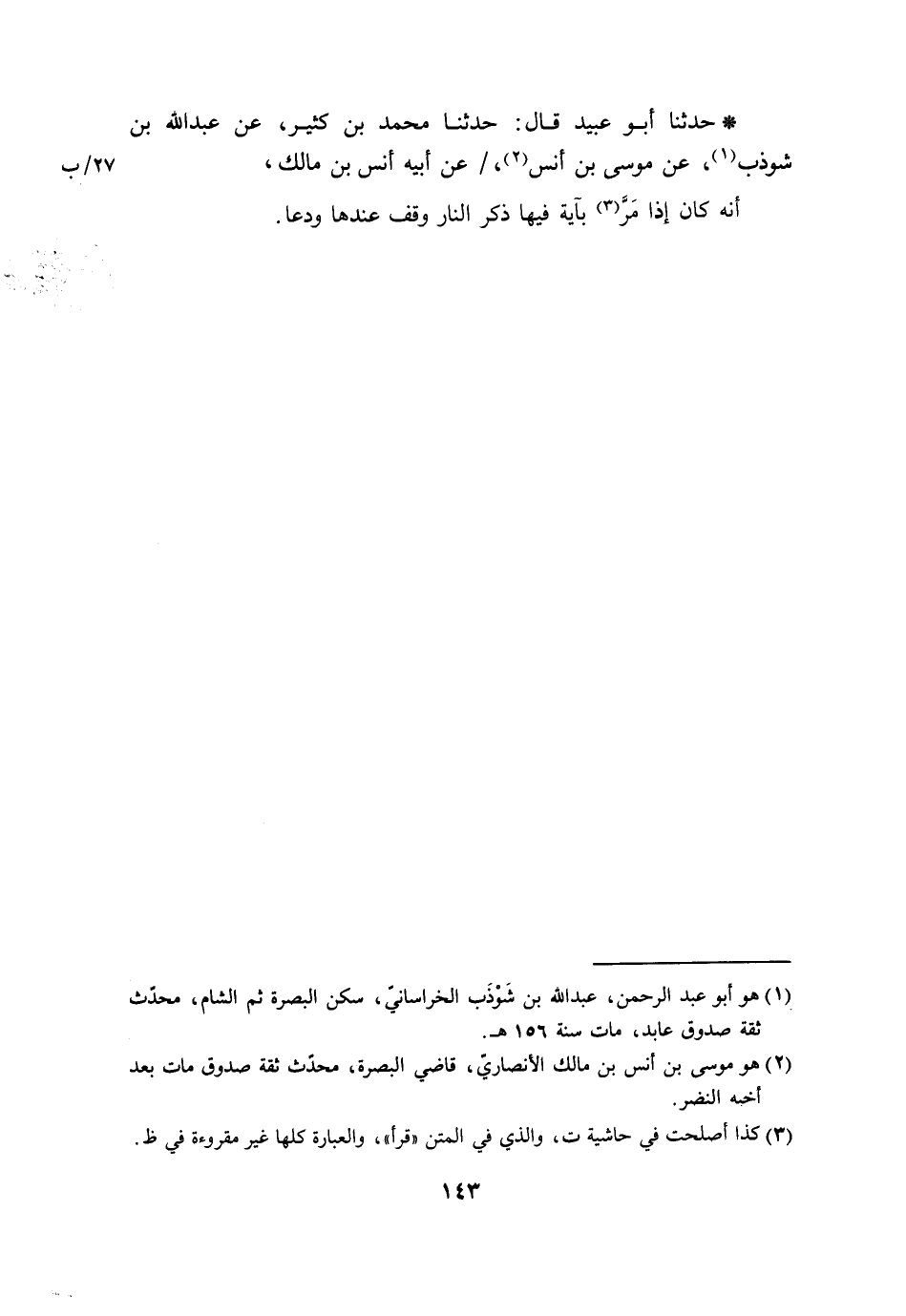 حَدَّثَنَا أَبُو عُبَيْدٍ قَالَ حَدَّثَنَا مُحَمَّدُ بْنُ كَثِيرٍ، عَنْ عَبْدِ اللَّهِ بْنِ شَوْذَبٍ، عَنْ مُوسَى بْنِ أَنَسٍ، عَنْ أَبِيهِ أَنَسِ بْنِ مَالِكٍ، أَنَّهُ §كَانَ إِذَا مَرَّ بِآيَةٍ فِيهَا ذِكْرُ النَّارِ وَقَفَ عِنْدَهَا وَدَعَا