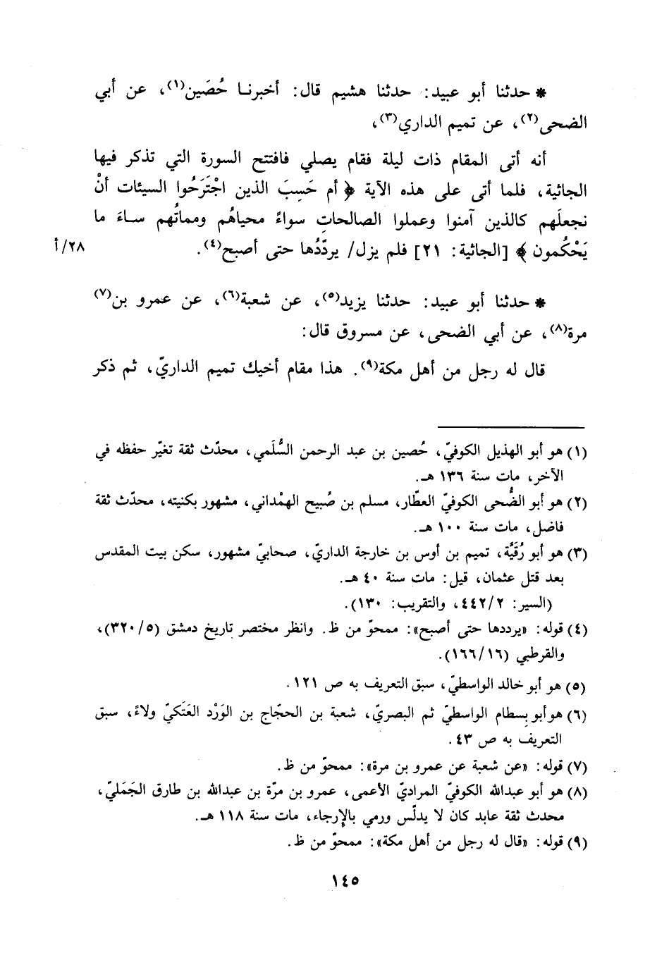 حَدَّثَنَا أَبُو عُبَيْدٍ حَدَّثَنَا هُشَيْمٌ، قَالَ: أَخْبَرَنَا حُصَيْنٌ، عَنْ أَبِي الضُّحَى، عَنْ تَمِيمٍ الدَّارِيِّ، أَنَّهُ أَتَى الْمَقَامَ ذَاتَ لَيْلَةٍ , فَقَامَ يُصَلِّي فَافْتَتَحَ السُّورَةَ الَّتِي تُذْكَرُ فِيهَا الْجَاثِيَةُ، فَلَمَّا أَتَى عَلَى هَذِهِ الْآيَةِ {§أَمْ حَسِبَ الَّذِينَ اجْتَرَحُوا السَّيِّئَاتِ أَنْ نَجْعَلَهُمْ كَالَّذِينَ آمَنُوا وَعَمِلُوا الصَّالِحَاتِ سَوَاءً مَحْيَاهُمْ وَمَمَاتُهُمْ سَاءَ مَا يَحْكُمُونَ} [الجاثية: 21] فَلَمْ يَزَلْ يُرَدِّدُهَا حَتَّى أَصْبَحَ حَدَّثَنَا أَبُو عُبَيْدٍ حَدَّثَنَا يَزِيدُ، عَنْ شُعْبَةَ، عَنْ عَمْرِو بْنِ مُرَّةَ، عَنْ أَبِي الضُّحَى، عَنْ مَسْرُوقٍ، قَالَ: قَالَ لَهُ رَجُلٌ مِنْ أَهْلِ مَكَّةَ، هَذَا مَقَامُ أَخِيكَ تَمِيمٍ الدَّارِيِّ. ثُمَّ ذَكَرَ -[146]- مِثْلَ ذَلِكَ أَوْ نَحْوَهُ