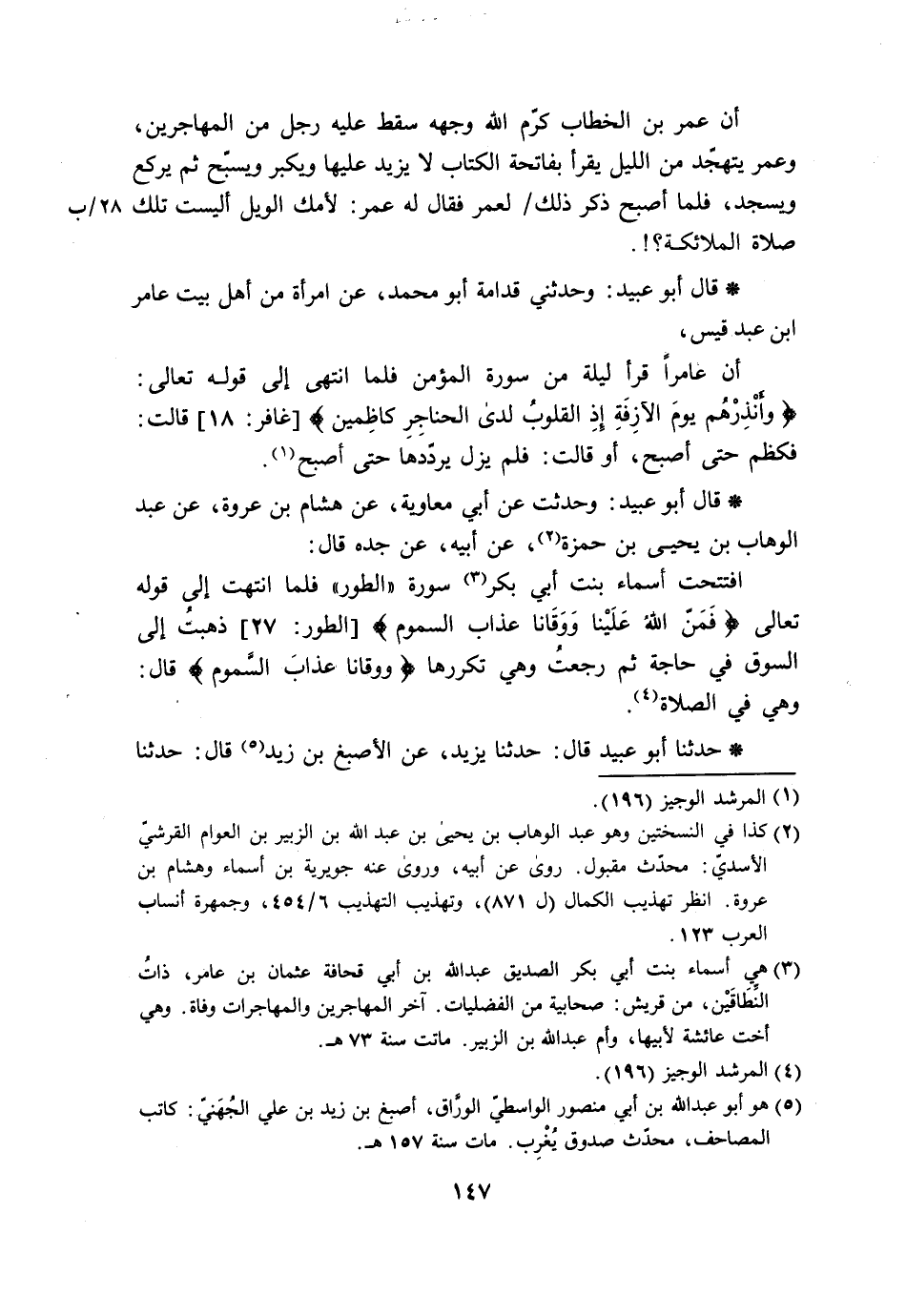 قَالَ أَبُو عُبَيْدٍ وَحُدِّثْتُ عَنْ أَبِي مُعَاوِيَةَ، عَنْ هِشَامِ بْنِ عُرْوَةَ، عَنْ عَبْدِ الْوَهَّابِ بْنِ يَحْيَى بْنِ حَمْزَةَ، عَنْ أَبِيهِ، عَنْ جَدِّهِ، قَالَ: §افْتَتَحَتْ أَسْمَاءُ بِنْتُ أَبِي بَكْرٍ سُورَةَ الطُّورِ، فَلَمَّا انْتَهَتْ إِلَى قَوْلِهِ تَعَالَى {فَمَنَّ اللَّهُ عَلَيْنَا وَوَقَانَا عَذَابَ السَّمُومِ} [الطور: 27] ذَهَبْتُ إِلَى السُّوقِ فِي حَاجَةٍ , ثُمَّ رَجَعْتُ وَهِيَ تُكَرِّرُهَا {وَوَقَانَا عَذَابَ السَّمُومِ} [الطور: 27] قَالَ: وَهِيَ فِي الصَّلَاةِ