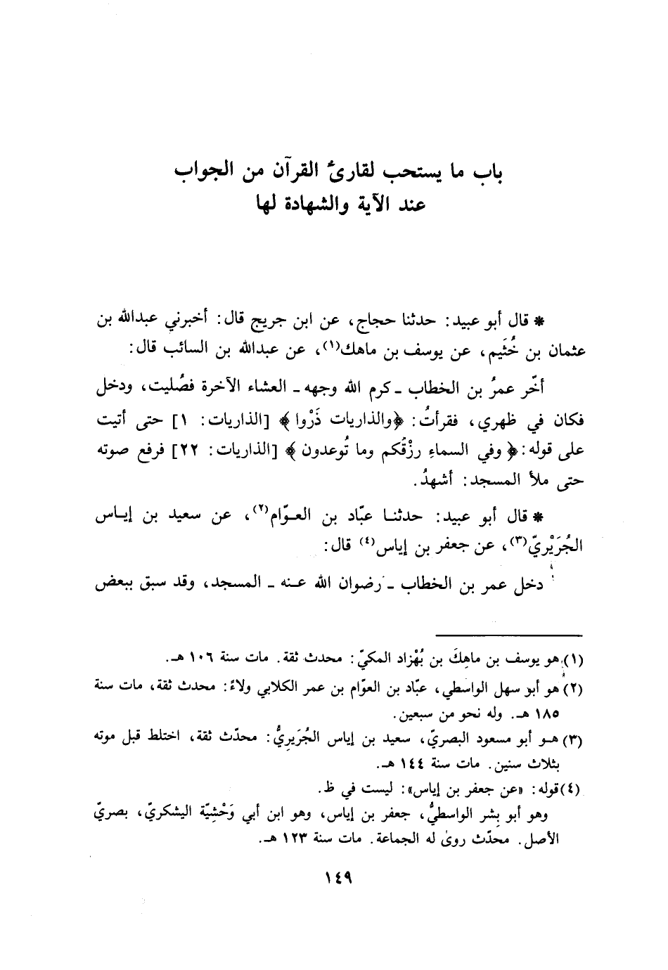 قَالَ أَبُو عُبَيْدٍ حَدَّثَنَا عَبَّادُ بْنُ الْعَوَّامِ، عَنْ سَعِيدِ بْنِ إِيَاسٍ الْجُرَيْرِيِّ، عَنْ جَعْفَرِ بْنِ إِيَاسٍ، قَالَ: §دَخَلَ عُمَرُ بْنُ الْخَطَّابِ رِضْوَانُ اللَّهِ عَنْهُ الْمَسْجِدَ، وَقَدْ سُبِقَ بِبَعْضِ -[150]- الصَّلَاةِ، فَنَشَبَ فِي الصَّفِّ , وَقَرَأَ الْإِمَامُ {وَفِي السَّمَاءِ رِزْقُكُمْ وَمَا تُوعَدُونَ} [الذاريات: 22] فَقَالَ عُمَرُ: «وَأَنَا أَشْهَدُ»