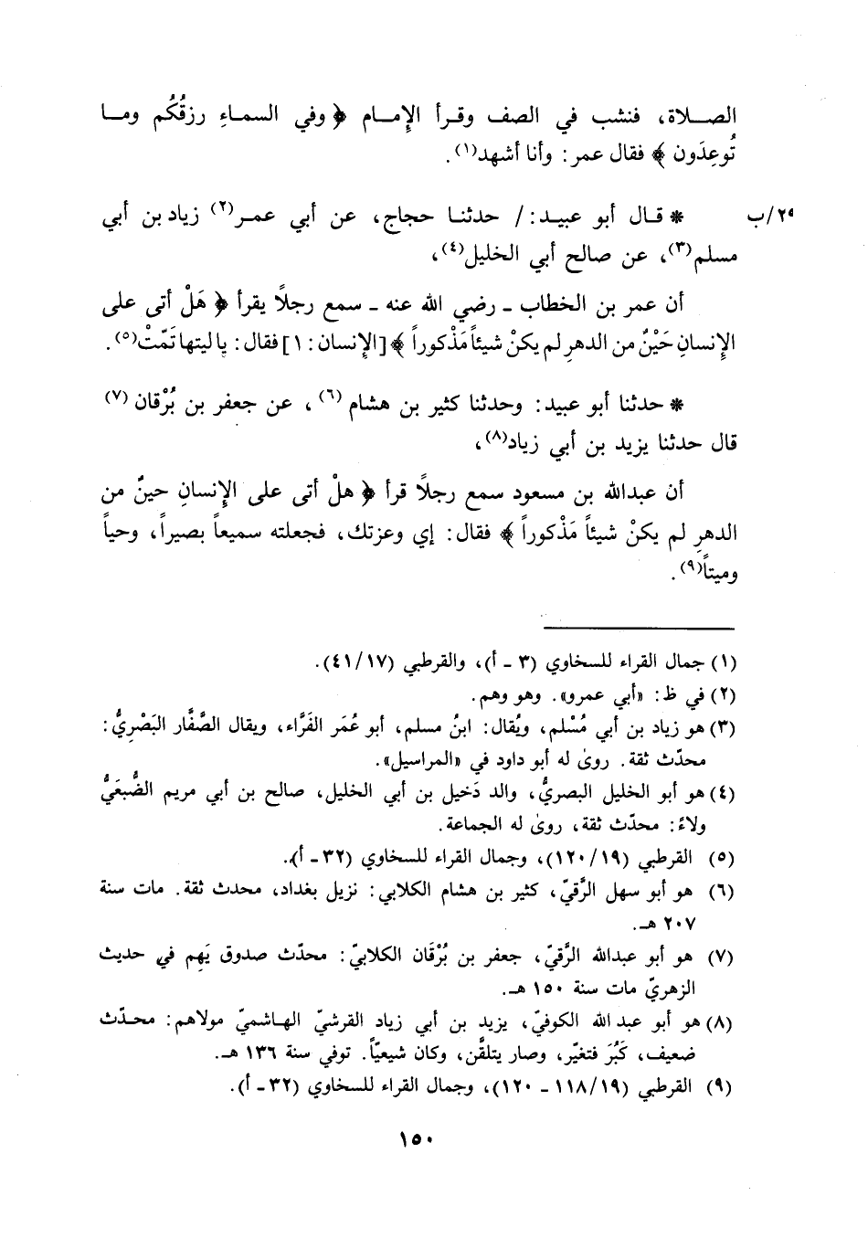 قَالَ أَبُو عُبَيْدٍ حَدَّثَنَا حَجَّاجٌ، عَنْ أَبِي عُمَرَ , زِيَادِ بْنِ أَبِي مُسْلِمٍ، عَنْ صَالِحٍ أَبِي الْخَلِيلِ، أَنَّ عُمَرَ بْنَ الْخَطَّابِ، رَضِيَ اللَّهُ عَنْهُ سَمِعَ رَجُلًا، يَقْرَأُ {§هَلْ أَتَى عَلَى الْإِنْسَانِ حِينٌ مِنَ الدَّهْرِ لَمْ يَكُنْ شَيْئًا مَذْكُورًا} [الإنسان: 1] فَقَالَ: «يَا لَيْتَهَا تَمَّتْ»