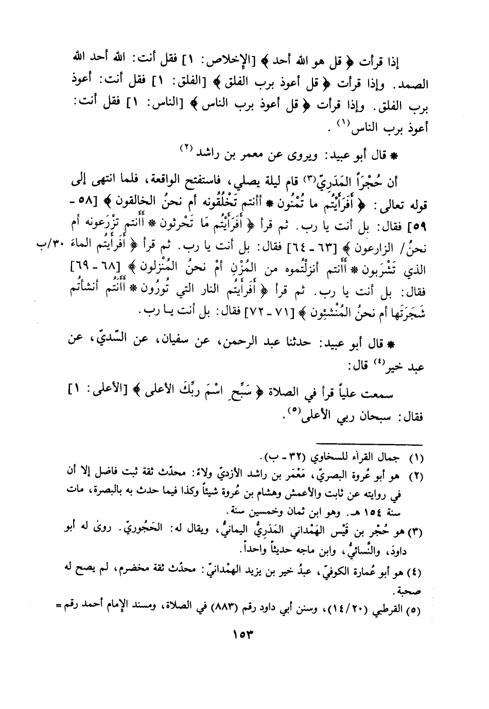 " §إِذَا قَرَأْتَ {قُلْ هُوَ اللَّهَ أَحَدٌ} [الإخلاص: 1] فَقُلْ أَنْتَ: اللَّهُ أَحَدٌ اللَّهُ الصَّمَدُ. وَإِذَا قَرَأْتَ {قُلْ أَعُوذُ بِرَبِّ الْفَلَقِ} [الفلق: 1] فَقُلْ أَنْتَ: أَعُوذُ بِرَبِّ الْفَلَقِ. وَإِذَا قَرَأْتَ {قُلْ أَعُوذُ بِرَبِّ النَّاسِ} [الناس: 1] فَقُلْ أَنْتَ: أَعُوذُ بِرَبِّ النَّاسِ ". قَالَ أَبُو عُبَيْدٍ: وَيُرْوَى عَنْ مَعْمَرِ بْنِ رَاشِدٍ، أَنَّ حُجْرًا الْمَدَرِيَّ قَامَ لَيْلَهُ يُصَلِّي، فَاسْتَفْتَحَ الْوَاقِعَةَ، فَلَمَّا انْتَهَى إِلَى قَوْلِهِ تَعَالَى {أَفَرَأَيْتُمْ مَا تُمْنُونَ، أَأَنْتُمْ تَخْلُقُونَهُ أَمْ نَحْنُ الْخَالِقُونَ} [الواقعة: 59] فَقَالَ: بَلْ أَنْتَ يَا رَبِّ. ثُمَّ قَرَأَ {أَفَرَأَيْتُمْ مَا تَحْرُثُونَ، أَأَنْتُمْ تَزْرَعُونَهُ أَمْ نَحْنُ الزَّارِعُونَ} [الواقعة: 63] فَقَالَ: بَلْ أَنْتَ يَا رَبِّ. ثُمَّ قَرَأَ {أَفَرَأَيْتُمُ الْمَاءَ الَّذِي تَشْرَبُونَ أَأَنْتُمْ أَنْزَلْتُمُوهُ مِنَ الْمَزْنِ أَمْ نَحْنُ الْمُنْزِلَونَ} [الواقعة: 68] فَقَالَ: بَلْ أَنْتَ يَا رَبِّ. ثُمَّ قَرَأَ {أَفَرَأَيْتُمُ النَّارَ الَّتِي تُورُونَ، أَأَنْتُمْ أَنْشَأْتُمْ شَجَرَتَهَا أَمْ نَحْنُ الْمُنْشِئُونَ} فَقَالَ: بَلْ أَنْتَ يَا رَبِّ "