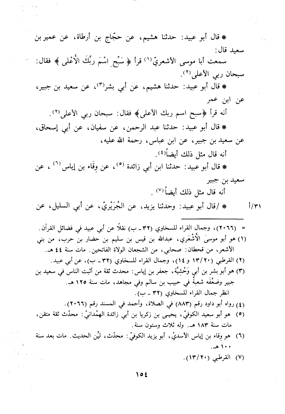 قَالَ أَبُو عُبَيْدٍ حَدَّثَنَا هُشَيْمٌ، عَنْ أَبِي بِشْرٍ، عَنْ سَعِيدِ بْنِ جُبَيْرٍ، عَنِ ابْنِ عُمَرَ، أَنَّهُ قَرَأَ {§سَبِّحِ اسْمَ رَبِّكَ الْأَعْلَى} [الأعلى: 1] فَقَالَ: «سُبْحَانَ رَبِّيَ الْأَعْلَى» قَالَ أَبُو عُبَيْدٍ حَدَّثَنَا عَبْدُ الرَّحْمَنِ، عَنْ سُفْيَانَ، عَنْ أَبِي إِسْحَاقَ، عَنْ سَعِيدِ بْنِ جُبَيْرٍ، عَنِ ابْنِ عَبَّاسٍ، رَحْمَةُ اللَّهِ عَلَيْهِ، أَنَّهُ قَالَ مِثْلَ ذَلِكَ أَيْضًا قَالَ أَبُو عُبَيْدٍ حَدَّثَنَا ابْنُ أَبِي زَائِدَةَ، عَنْ وِقَاءَ بْنِ إِيَاسٍ , عَنْ سَعِيدِ بْنِ جُبَيْرٍ، أَنَّهُ قَالَ مِثْلَ ذَلِكَ أَيْضًا