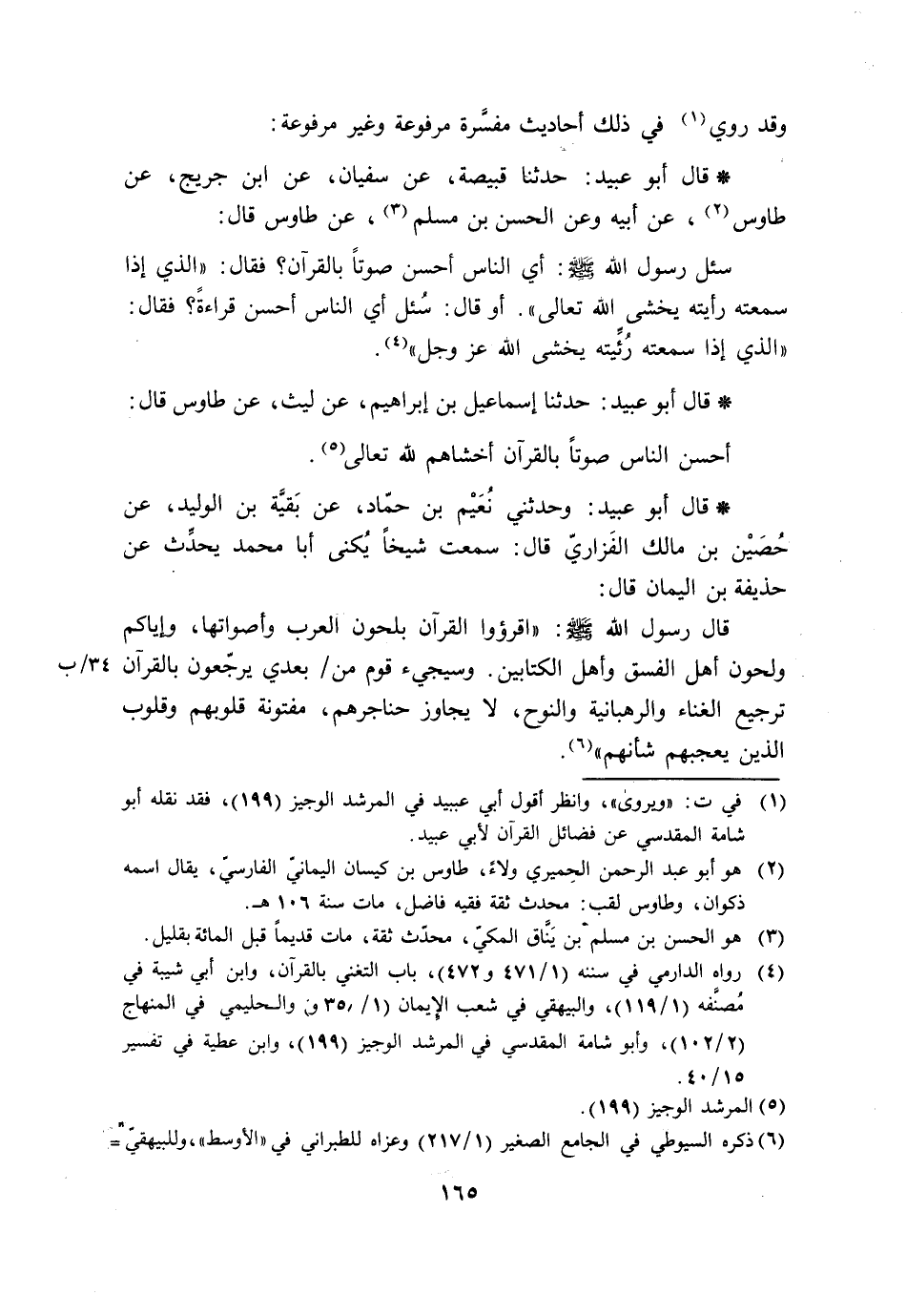 قَالَ أَبُو عُبَيْدٍ حَدَّثَنَا إِسْمَاعِيلُ بْنُ إِبْرَاهِيمَ، عَنْ لَيْثٍ، عَنْ طَاوُسٍ، قَالَ: «§أَحْسَنُ النَّاسِ صَوْتًا بِالْقُرْآنِ أَخْشَاهُمْ لِلَّهِ تَعَالَى»