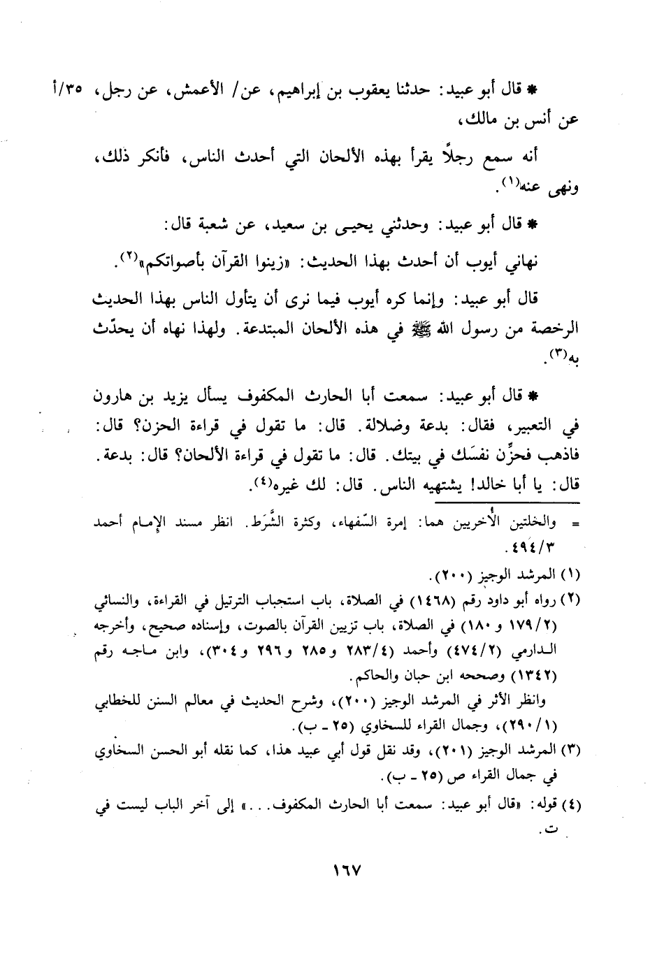 قَالَ أَبُو عُبَيْدٍ حَدَّثَنَا يَعْقُوبُ بْنُ إِبْرَاهِيمَ، عَنِ الْأَعْمَشِ، عَنْ رَجُلٍ، عَنْ أَنَسِ بْنِ مَالِكٍ، أَنَّهُ §سَمِعَ رَجُلًا، يَقْرَأُ بِهَذِهِ الْأَلْحَانِ الَّتِي أَحْدَثَ النَّاسُ، فَأَنْكَرَ ذَلِكَ، وَنَهَى عَنْهُ