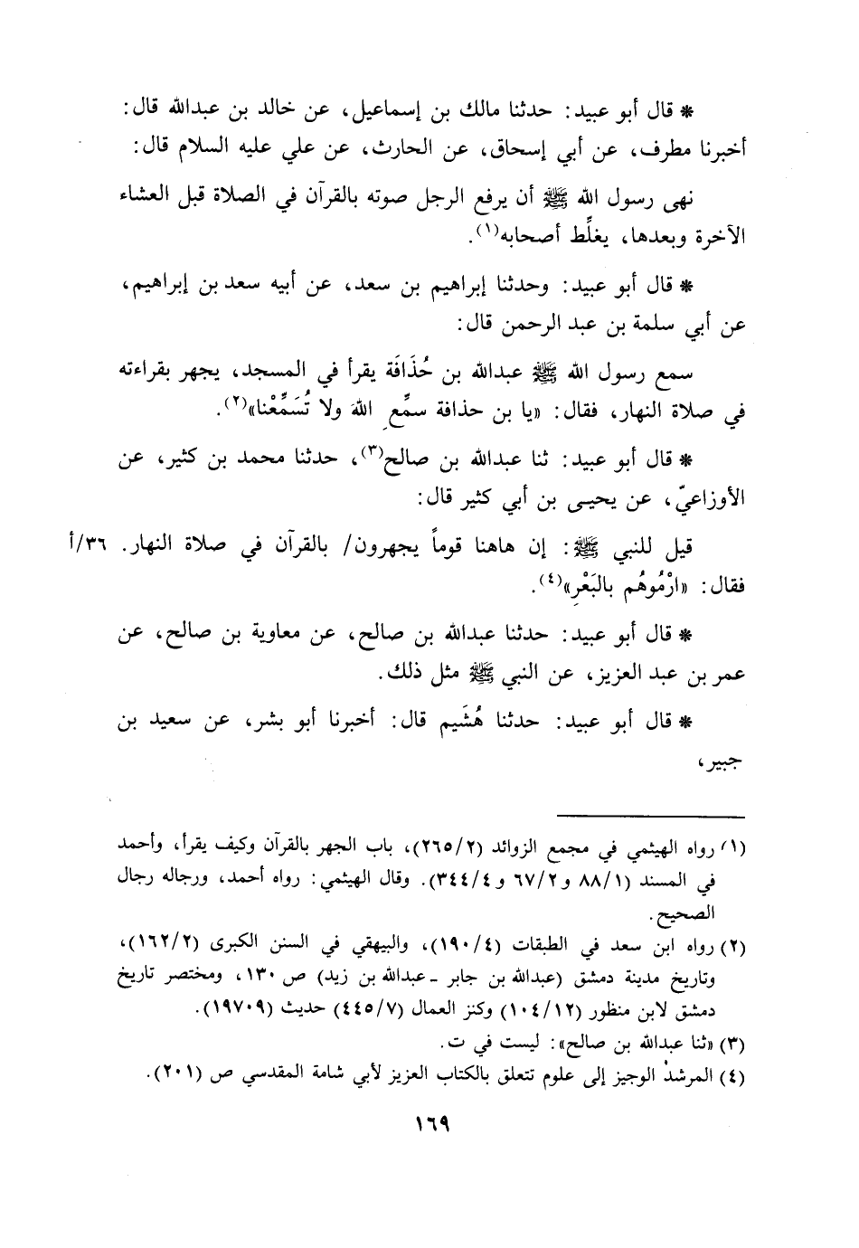 قَالَ أَبُو عُبَيْدٍ ثنا عَبْدُ اللَّهِ بْنُ صَالِحٍ، حَدَّثَنَا مُحَمَّدُ بْنُ كَثِيرٍ، عَنِ الْأَوْزَاعِيِّ، عَنْ يَحْيَى بْنِ أَبِي كَثِيرٍ، قَالَ: قِيلَ لِلنَّبِيِّ صَلَّى اللَّهُ عَلَيْهِ وَسَلَّمَ: إِنَّ هَاهُنَا قَوْمًا يَجْهَرُونَ بِالْقُرْآنِ فِي صَلَاةِ النَّهَارِ. فَقَالَ: «§ارْمُوهُمْ بِالْبَعْرِ» قَالَ أَبُو عُبَيْدٍ حَدَّثَنَا عَبْدُ اللَّهِ بْنُ صَالِحٍ، عَنْ مُعَاوِيَةَ بْنِ صَالِحٍ، عَنْ عُمَرَ بْنِ عَبْدِ الْعَزِيزِ، عَنِ النَّبِيِّ صَلَّى اللَّهُ عَلَيْهِ وَسَلَّمَ مِثْلَ ذَلِكَ