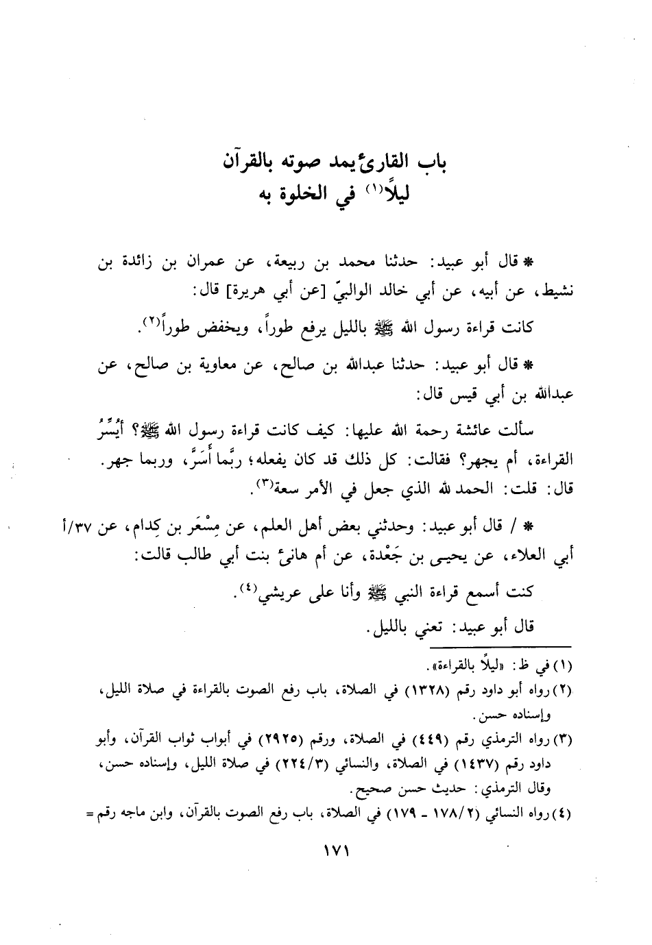 قَالَ أَبُو عُبَيْدٍ وَحَدَّثَنِي بَعْضُ أَهْلِ الْعِلْمِ عَنْ مِسْعَرِ بْنِ كِدَامٍ، عَنْ أَبِي الْعَلَاءِ، عَنْ يَحْيَى بْنِ جَعْدَةَ، عَنْ أُمِّ هَانِئٍ بِنْتِ أَبِي طَالِبٍ، قَالَتْ: «§كُنْتُ أَسْمَعُ قِرَاءَةَ النَّبِيِّ صَلَّى اللَّهُ عَلَيْهِ وَسَلَّمَ وَأَنَا عَلَى عَرِيشِي» . قَالَ أَبُو عُبَيْدٍ: تَعْنِي بِاللَّيْلِ
