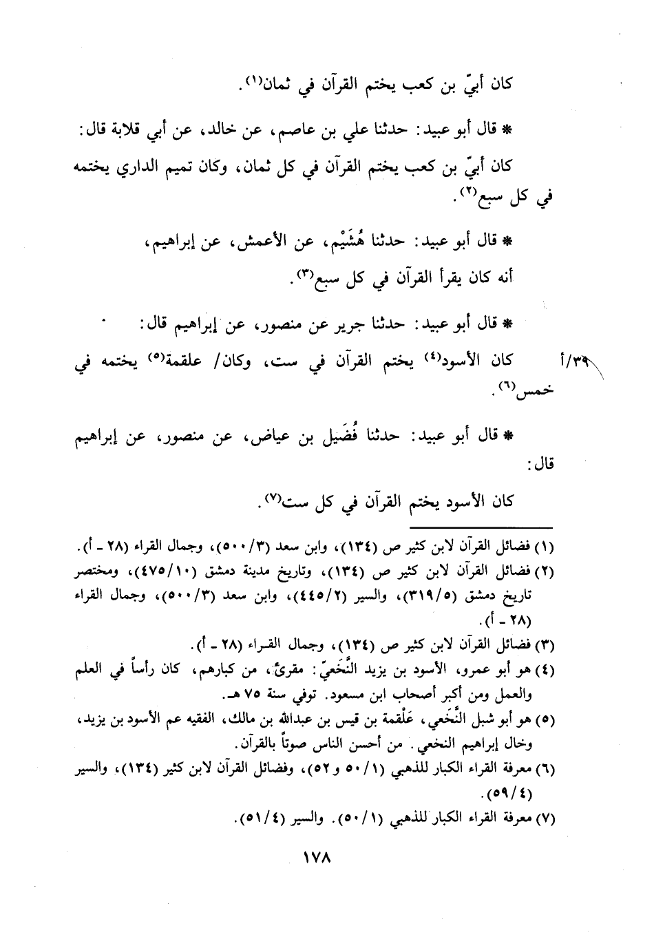 قَالَ أَبُو عُبَيْدٍ حَدَّثَنَا جَرِيرٌ عَنْ مَنْصُورٍ، عَنْ إِبْرَاهِيمَ قَالَ: §كَانَ الْأَسْوَدُ يَخْتِمُ الْقُرْآنَ فِي سِتٍّ، وَكَانَ عَلْقَمَةُ يَخْتِمُهُ فِي خَمْسٍ
