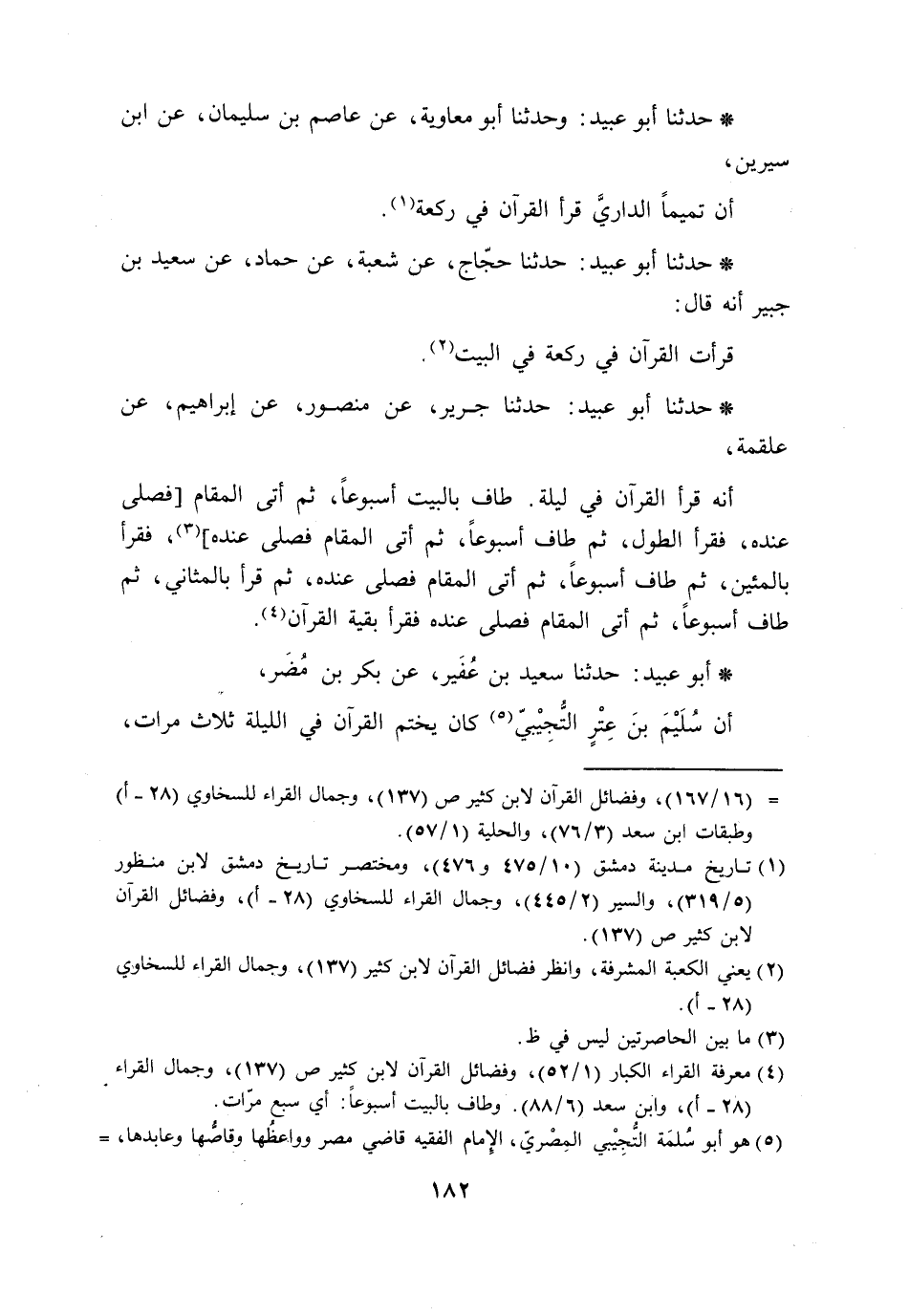حَدَّثَنَا أَبُو عُبَيْدٍ حَدَّثَنَا جَرِيرٌ، عَنْ مَنْصُورٍ، عَنْ إِبْرَاهِيمَ، عَنْ عَلْقَمَةَ، أَنَّهُ §قَرَأَ الْقُرْآنَ فِي لَيْلَةٍ. طَافَ بِالْبَيْتِ أُسْبُوعًا، ثُمَّ أَتَى الْمَقَامَ فَصَلَّى عِنْدَهُ، فَقَرَأَ الطُّوَلَ، ثُمَّ طَافَ أُسْبُوعًا، ثُمَّ أَتَى الْمَقَامَ فَصَلَّى عِنْدَهُ، فَقَرَأَ بِالْمِئِينَ، ثُمَّ طَافَ أُسْبُوعًا، ثُمَّ أَتَى الْمَقَامَ فَصَلَّى عِنْدَهُ، ثُمَّ قَرَأَ بِالْمَثَانِي، ثُمَّ طَافَ أُسْبُوعًا، ثُمَّ أَتَى الْمَقَامَ فَصَلَّى عِنْدَهُ فَقَرَأَ بَقِيَّةَ الْقُرْآنِ