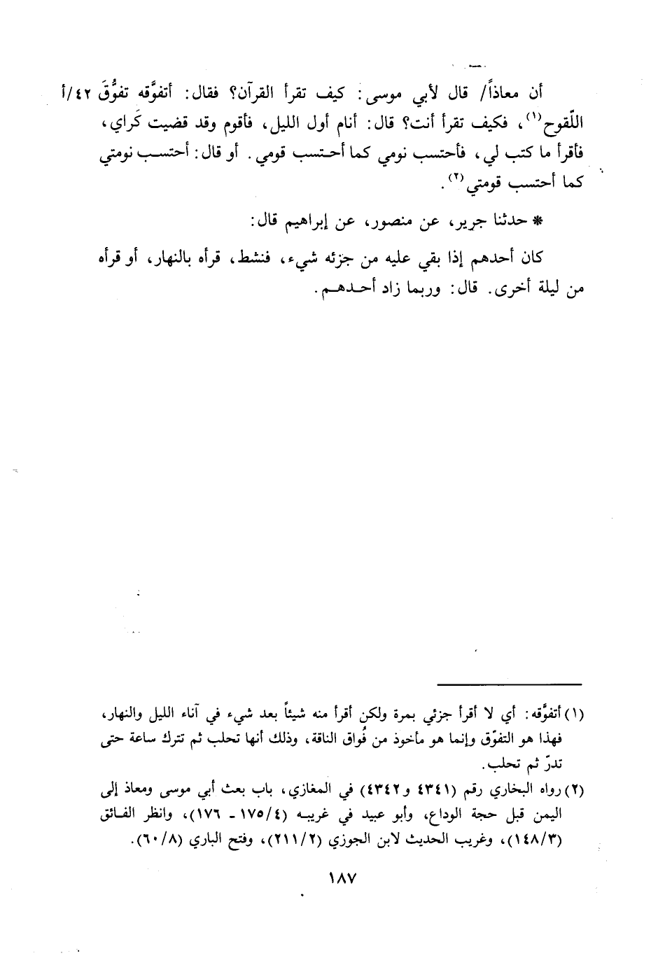 حَدَّثَنَا جَرِيرٌ، عَنْ مَنْصُورِ، عَنْ إِبْرَاهِيمَ، قَالَ: «§كَانَ أَحَدُهُمْ إِذَا بَقِيَ عَلَيْهِ مِنْ جُزْئِهِ شَيْءٌ، فَنَشَطَ، قَرَأَهُ بِالنَّهَارِ، أَوْ قَرَأَهُ مِنْ لَيْلَةٍ أُخْرَى» . قَالَ: «وَرُبَّمَا زَادَ أَحَدُهُمْ»