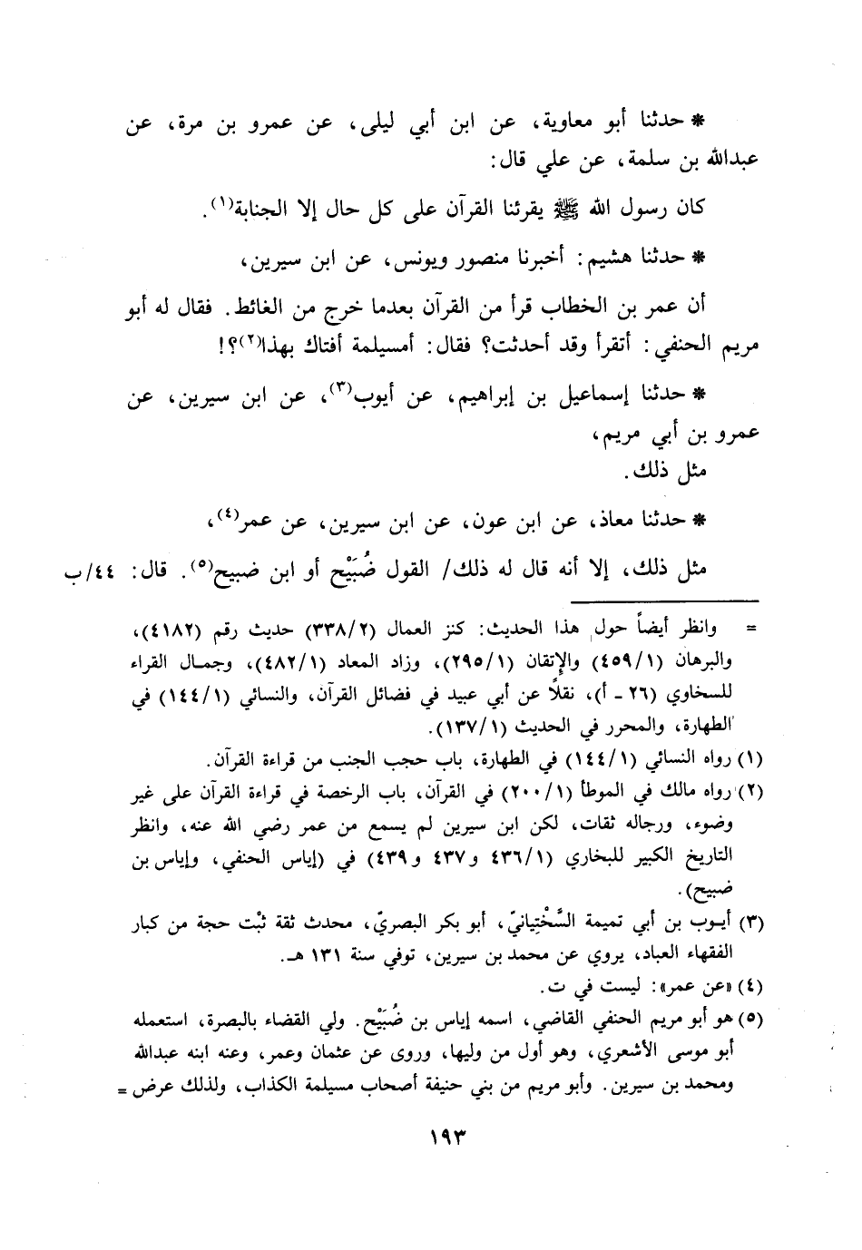 حَدَّثَنَا هُشَيْمٌ، أَخْبَرَنَا مَنْصُورٌ، وَيُونُسُ، عَنِ ابْنِ سِيرِينَ، أَنَّ عُمَرَ بْنَ الْخَطَّابِ، قَرَأَ مِنَ الْقُرْآنِ بَعْدَمَا خَرَجَ مِنَ الْغَائِطِ، فَقَالَ لَهُ أَبُو مَرْيَمَ الْحَنَفِيُّ: أَتَقْرَأُ وَقَدْ أَحْدَثْتَ؟ فَقَالَ: «§أَمُسَيْلَمَةُ أَفْتَاكَ بِهَذَا؟» حَدَّثَنَا إِسْمَاعِيلُ بْنُ إِبْرَاهِيمَ، عَنْ أَيُّوبَ، عَنِ ابْنِ سِيرِينَ، عَنْ عَمْرِو بْنِ أَبِي مَرْيَمَ، مِثْلَ ذَلِكَ حَدَّثَنَا مُعَاذٌ، عَنِ ابْنِ عَوْنٍ، عَنِ ابْنِ سِيرِينَ، عَنْ عُمَرَ، مِثْلَ ذَلِكَ. إِلَّا أَنَّهُ قَالَ لَهُ ذَلِكَ الْقَوْلَ ضُبَيْحٌ أَوِ ابْنُ ضُبَيْحٍ. قَالَ: -[194]- وَكَانُوا يَرَوْنَ أَنَّ قَلْبَ عُمَرَ عَلَيْهِ بَعْضُ الشِّدَّةِ. قَالَ: وَكَانُوا يَرَوْنَ أَنَّهُ قَتَلَ زَيْدَ بْنَ الْخَطَّابِ يَوْمَ الْيَمَامَةِ , فَقَالَ: يَا أَمِيرَ الْمُؤْمِنِينَ، إِنَّ اللَّهَ أَكْرَمَ زَيْدًا بِيَدِي، وَلَمْ يُهِنِّي بِيَدِهِ