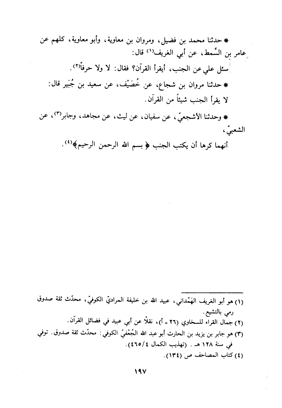 حَدَّثَنَا مُحَمَّدُ بْنُ فُضَيْلٍ، وَمَرْوَانُ بْنُ مُعَاوِيَةَ، وَأَبُو مُعَاوِيَةَ، كُلُّهُمْ عَنْ عَامِرِ بْنِ السِّمْطِ، عَنْ أَبِي الْغَرِيفِ، قَالَ: سُئِلَ عَلِيُّ عَنِ الْجُنُبِ؛ أَيَقْرَأُ الْقُرْآنَ؟ فَقَالَ: «§لَا وَلَا حَرْفًا»