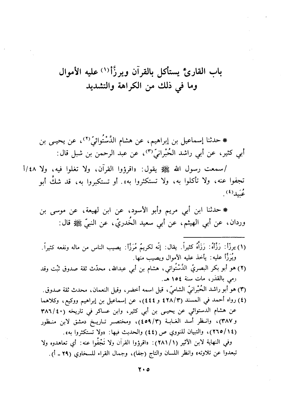 حَدَّثَنَا إِسْمَاعِيلُ بْنُ إِبْرَاهِيمَ، عَنْ هِشَامٍ الدَّسْتُوَائِيِّ، عَنْ يَحْيَى بْنِ أَبِي كَثِيرٍ، عَنْ أَبِي رَاشِدٍ الْحُبْرَانِيِّ، عَنْ عَبْدِ الرَّحْمَنِ بْنِ شِبْلٍ، قَالَ: سَمِعْتُ رَسُولَ اللَّهِ صَلَّى اللَّهُ عَلَيْهِ وَسَلَّمَ يَقُولُ: «§اقْرَءُوا الْقُرْآنَ، وَلَا تَغُلُّوا فِيهِ، وَلَا تَجْفُوا عَنْهُ، وَلَا تَأْكُلُوا بِهِ، وَلَا تَسْتَكْثِرُوا بِهِ» أَوْ تَسْتَكْبِرُوا بِهِ ". قَدْ شَكَّ أَبُو عُبَيْدٍ