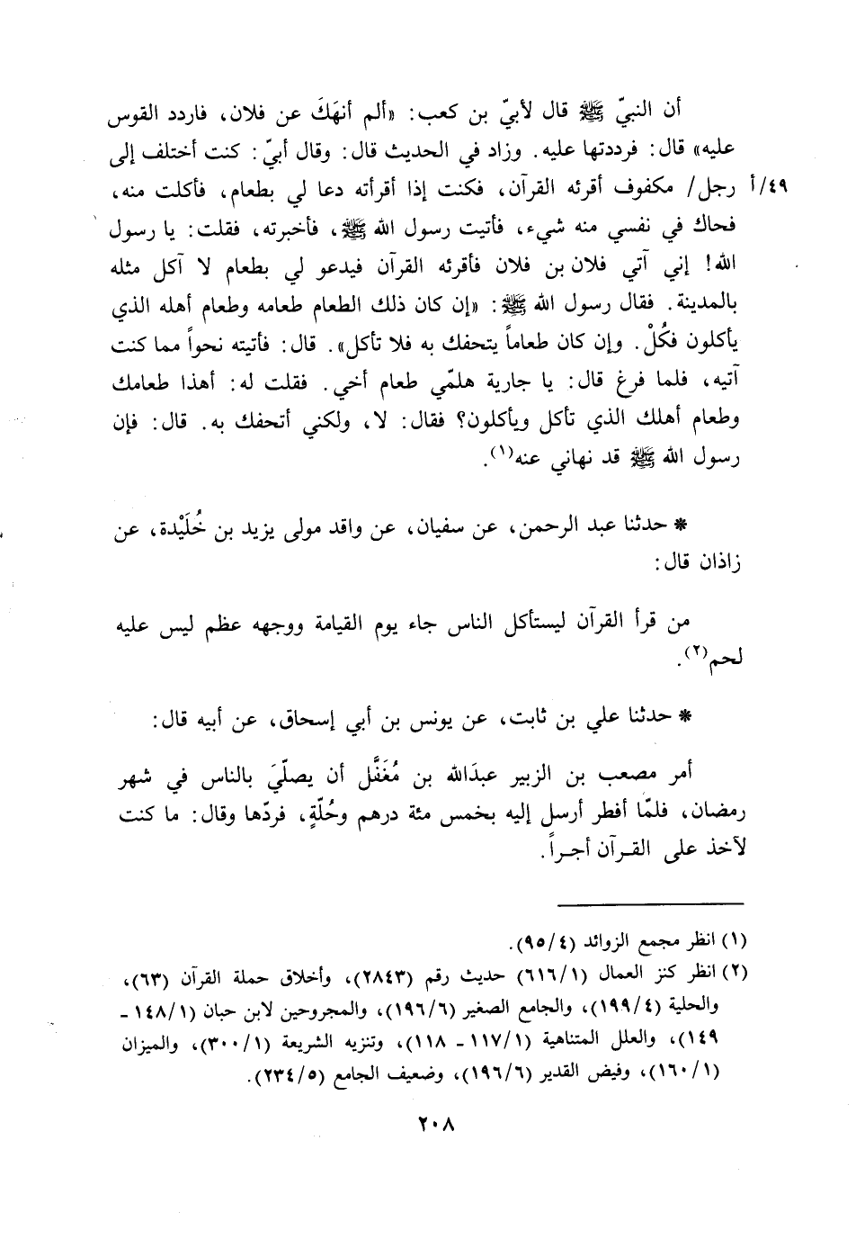 حَدَّثَنَا عَبْدُ الرَّحْمَنِ، عَنْ سُفْيَانَ، عَنْ وَاقِدٍ مَوْلَى يَزِيدَ بْنِ خُلَيْدَةَ، عَنْ زَاذَانَ، قَالَ: «§مَنْ قَرَأَ الْقُرْآنَ لِيَسْتَأْكِلَ النَّاسَ جَاءَ يَوْمَ الْقِيَامَةِ وَوَجْهُهُ عَظْمٌ لَيْسَ عَلَيْهِ لَحْمٌ»