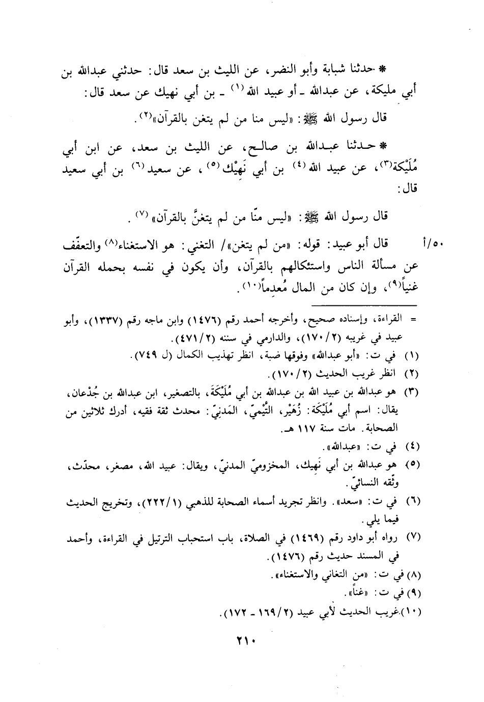 حَدَّثَنَا عَبْدُ اللَّهِ بْنُ صَالِحٍ، عَنِ اللَّيْثِ بْنِ سَعْدٍ، عَنِ ابْنِ أَبِي مُلَيْكَةَ، عَنْ عُبَيْدِ اللَّهِ بْنِ أَبِي نَهِيكٍ، عَنْ سَعِيدِ بْنِ أَبِي سَعِيدٍ، قَالَ: قَالَ رَسُولُ اللَّهِ صَلَّى اللَّهُ عَلَيْهِ وَسَلَّمَ: «§لَيْسَ مِنَّا مَنْ لَمْ يَتَغَنَّ بِالْقُرْآنِ» . قَالَ أَبُو عُبَيْدٍ: قَوْلُهُ: «مَنْ لَمْ يَتَغَنَّ» التَّغَنِّي: هُوَ الِاسْتِغْنَاءُ وَالتَّعَفُّفُ عَنْ مَسْأَلَةِ النَّاسِ وَاسْتِئْكَالِهِمْ بِالْقُرْآنِ، وَأَنْ يَكُونَ فِي نَفْسِهِ بِحَمْلِهِ الْقُرْآنَ غَنِيًّا، وَإِنْ كَانَ مِنَ الْمَالِ مُعْدِمًا